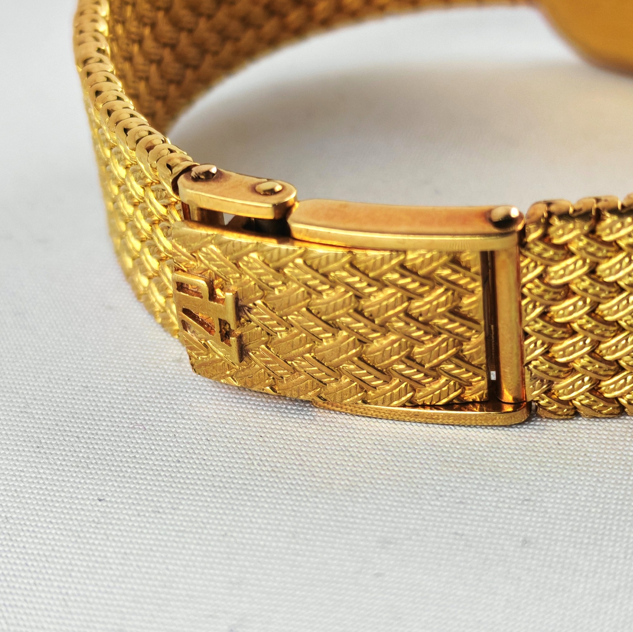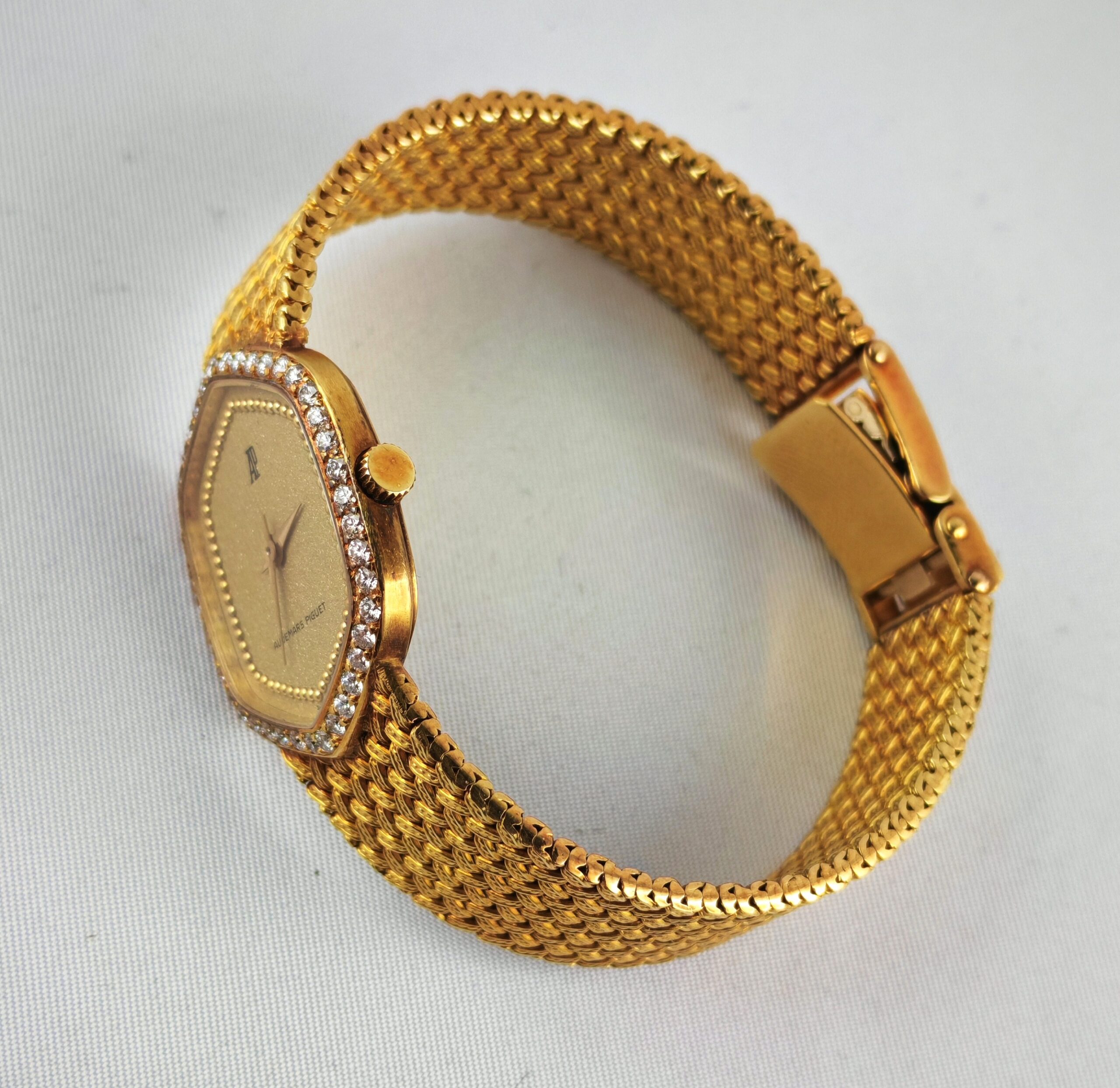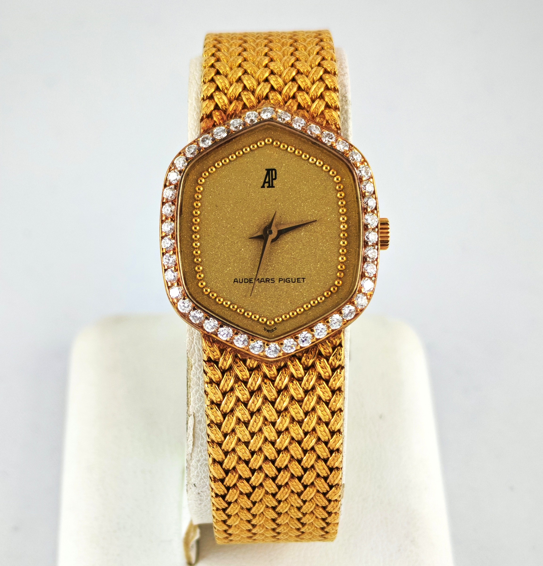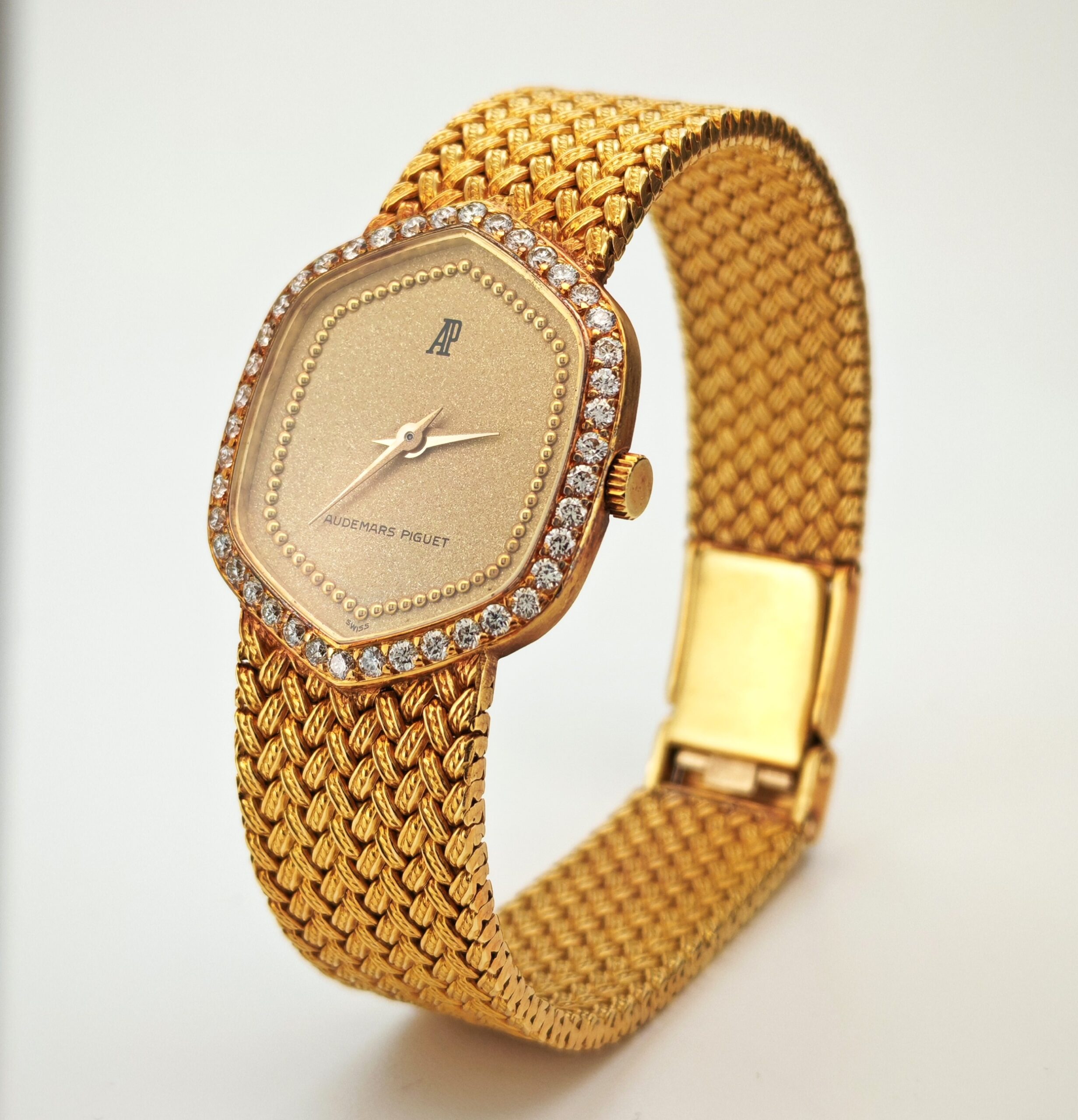 Questo raro orologio si distingue subito per i colori accesi dati dall’oro giallo e dalla lunetta tempestata di brillanti. Il look movimentato del bracciale a tessuto viene bilanciato da quello calmo ed elegante del quadrante champagne, accompagnato da una corona zigrinata.