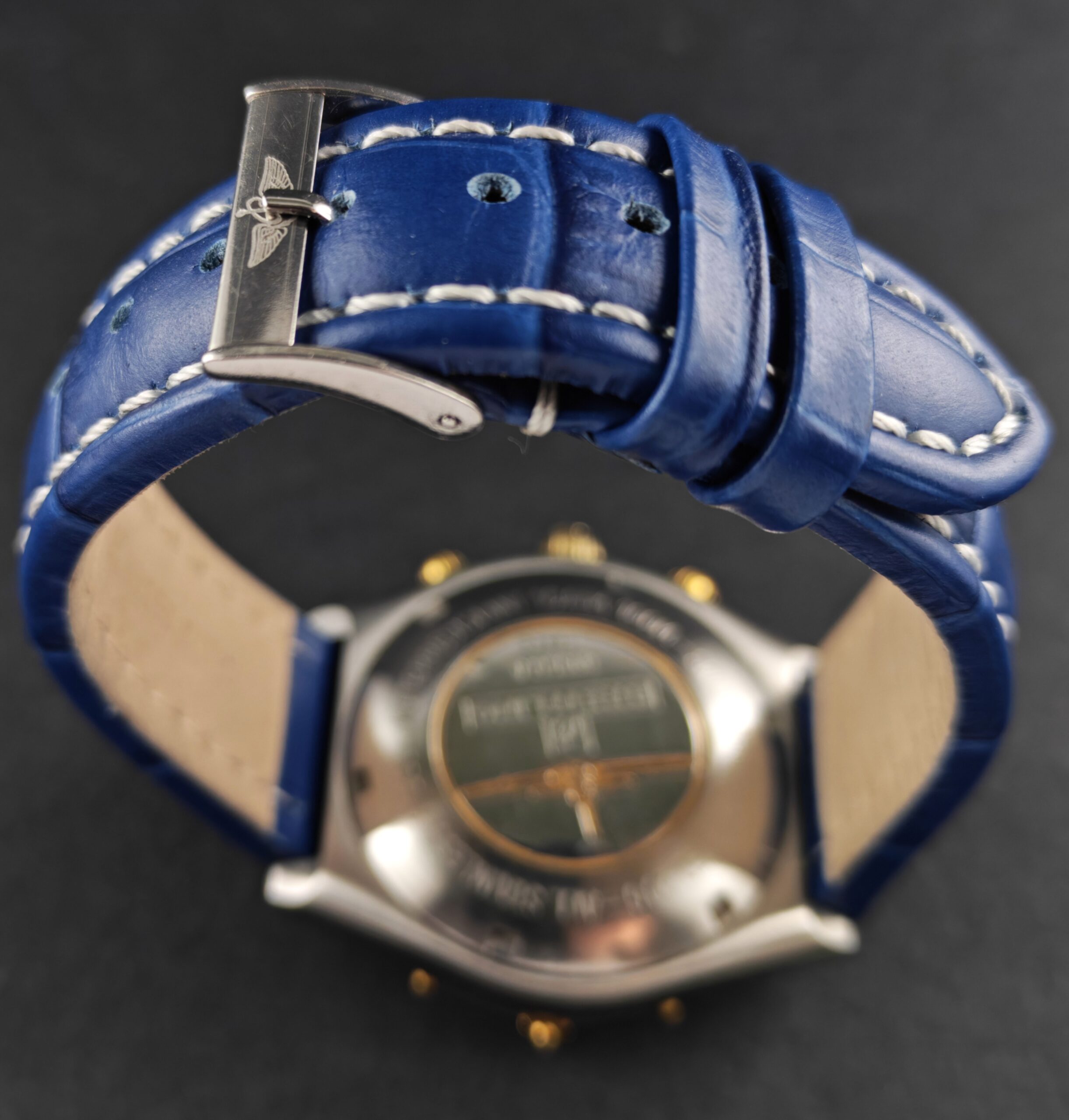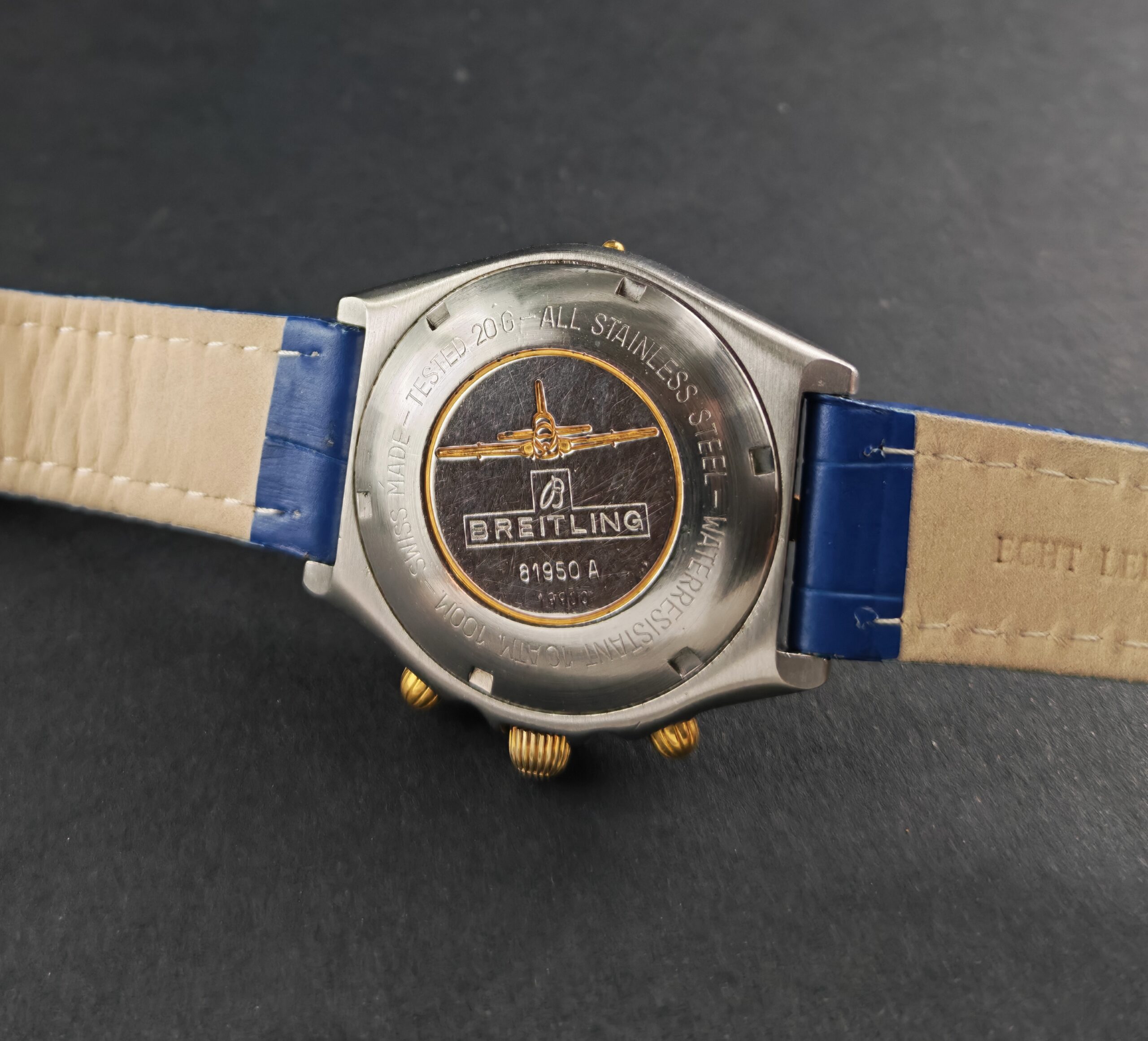 Questo modello in particolare si contraddistingue per il colore blu del quadrante e del cinturino, ma anche per l’incisione di un aereo sul fondello. Quest’ultimo dettaglio è caratteristico dei primi modelli prodotti con questa referenza, e l’aereo in questione è l’Aermacchi mb-339A usato dalle Frecce Tricolori.