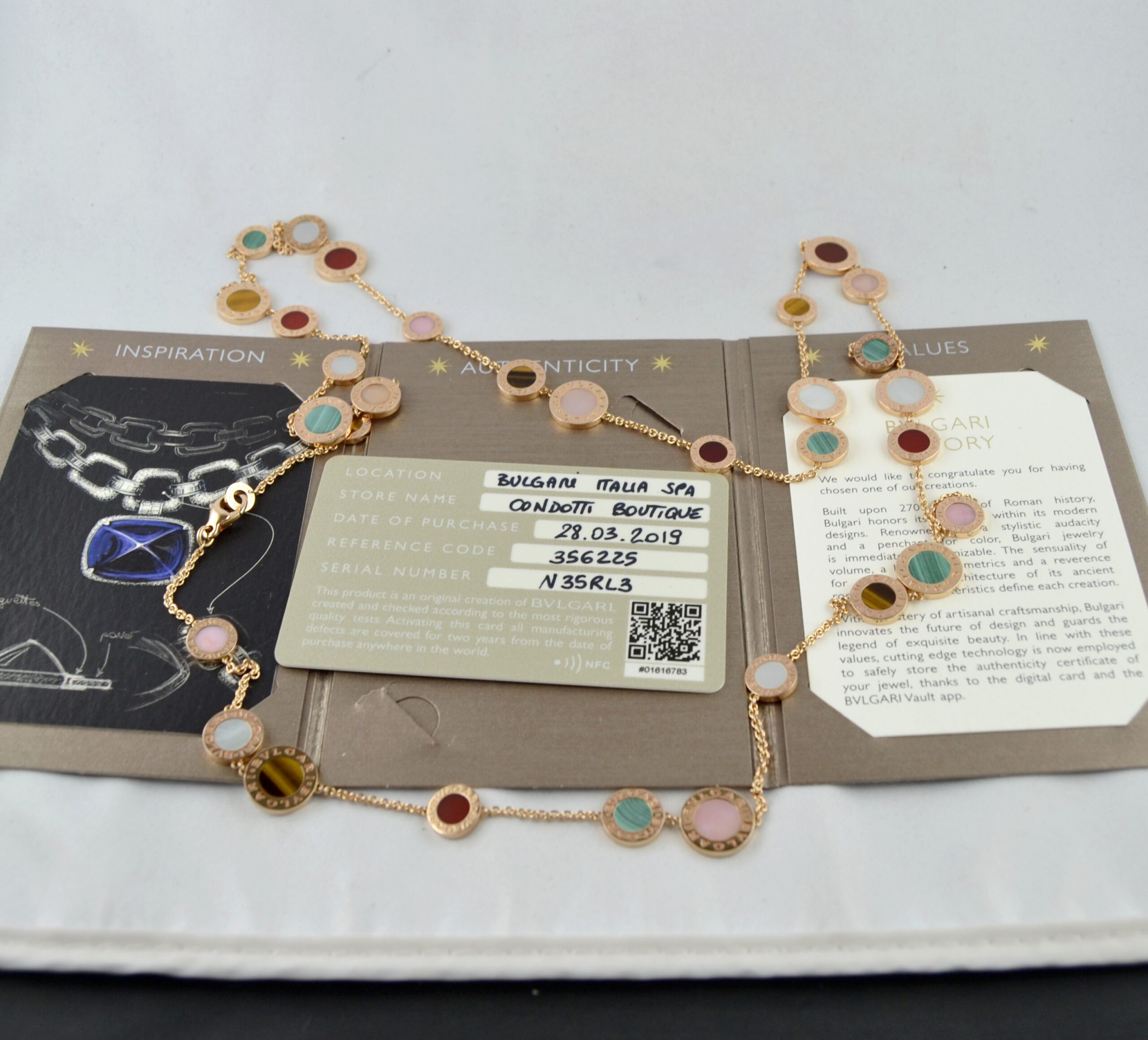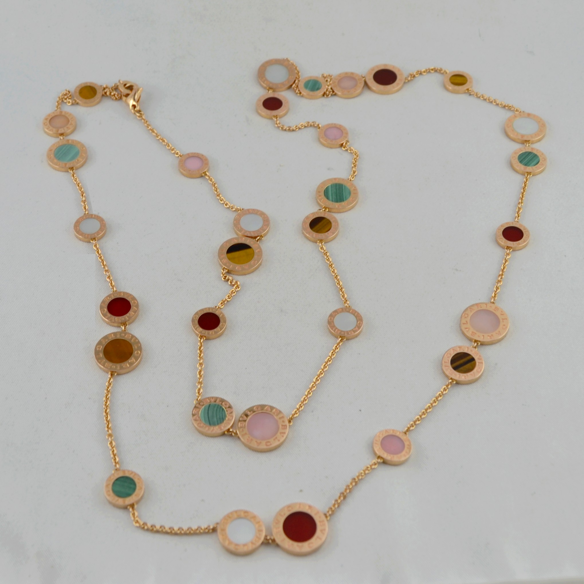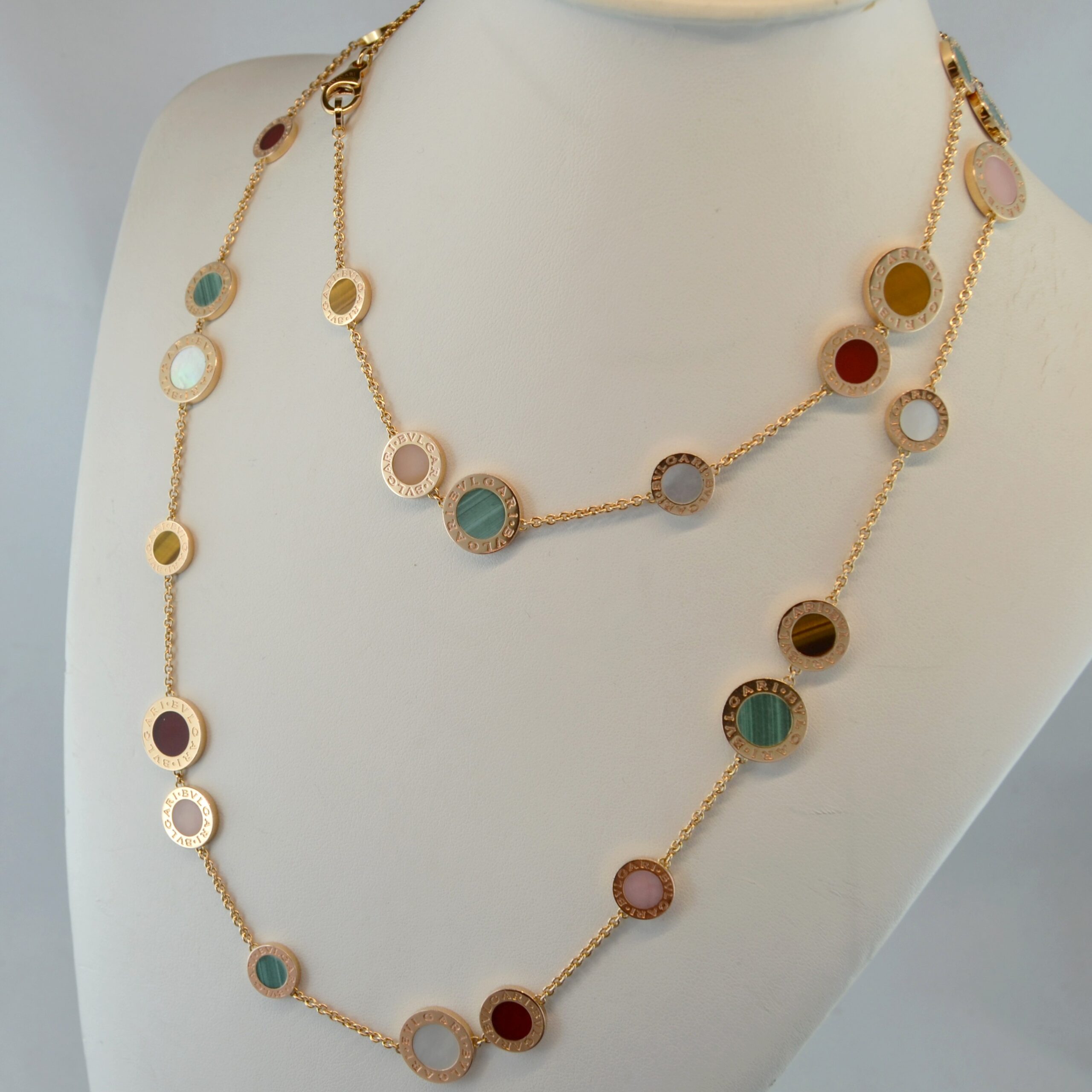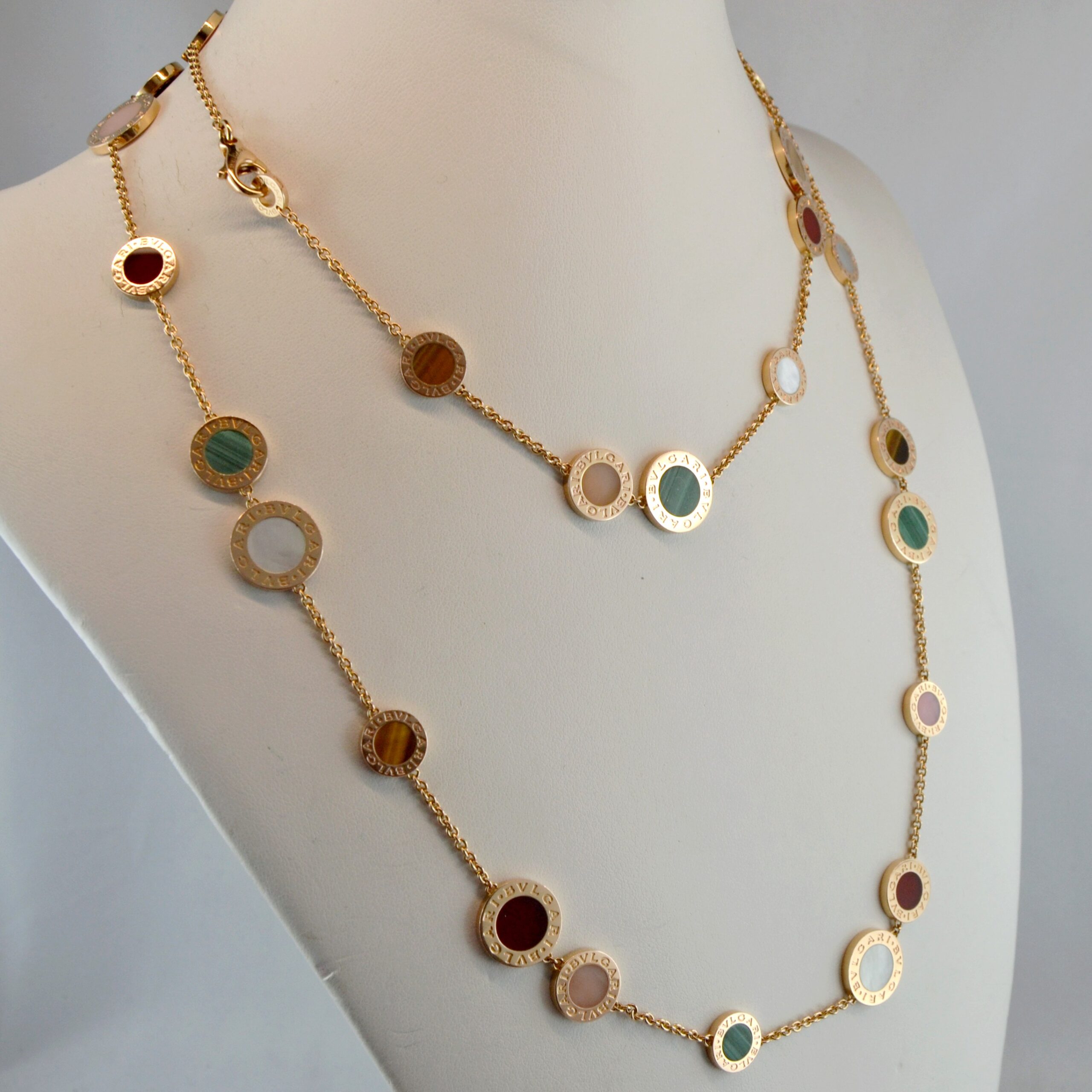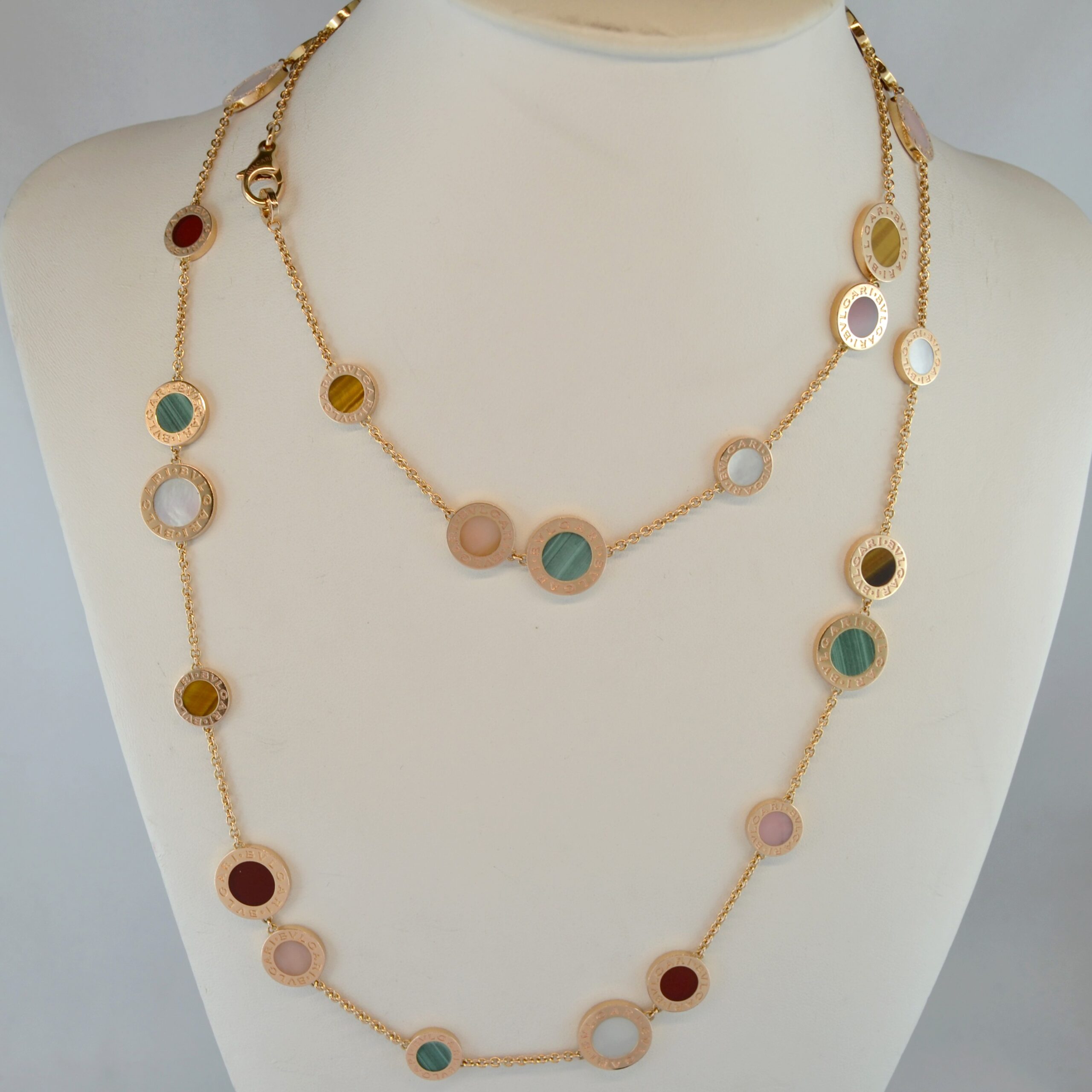 Vi presentiamo questa magnifica collana Bulgari in oro giallo 18kt e pietre colorate, con peso 56,07g.