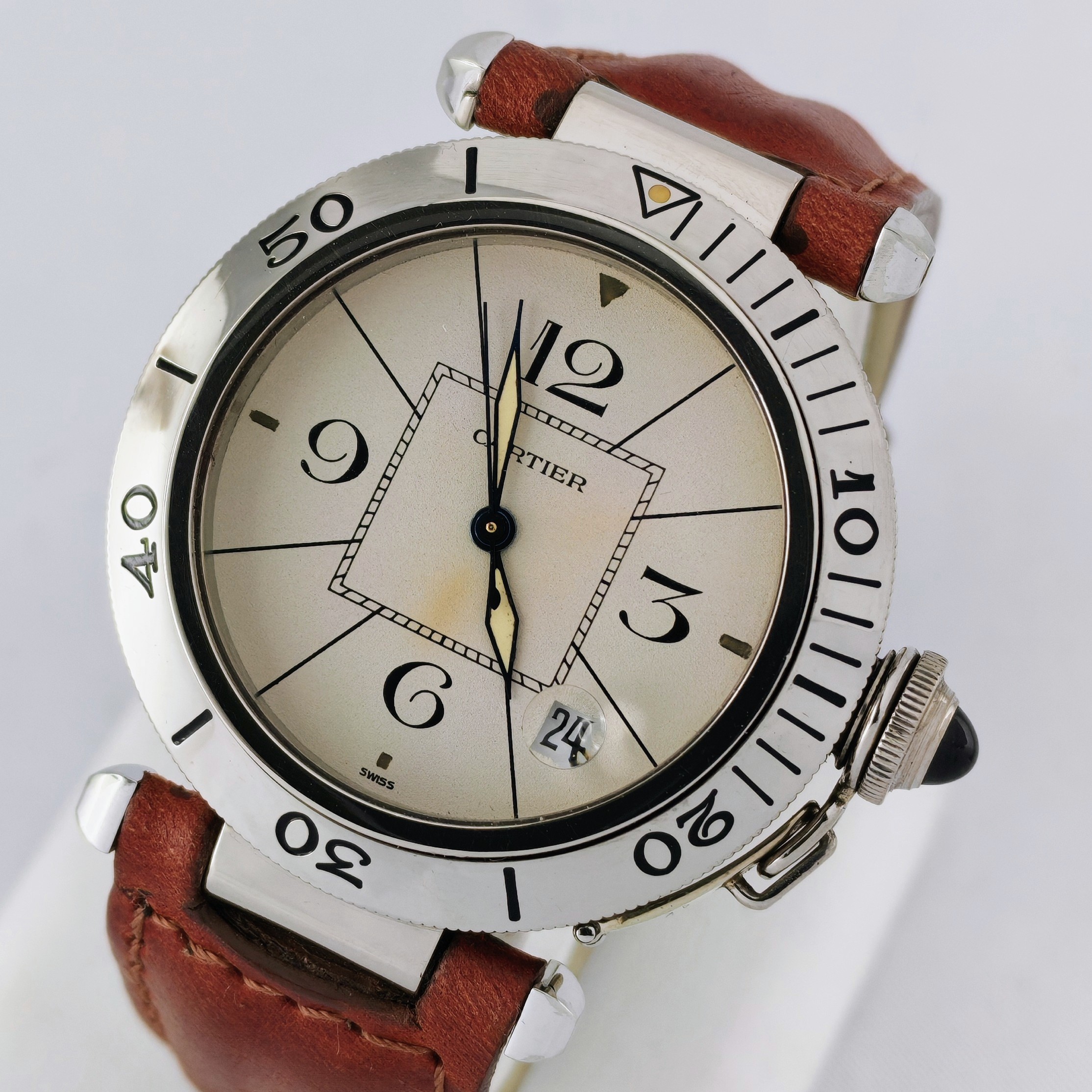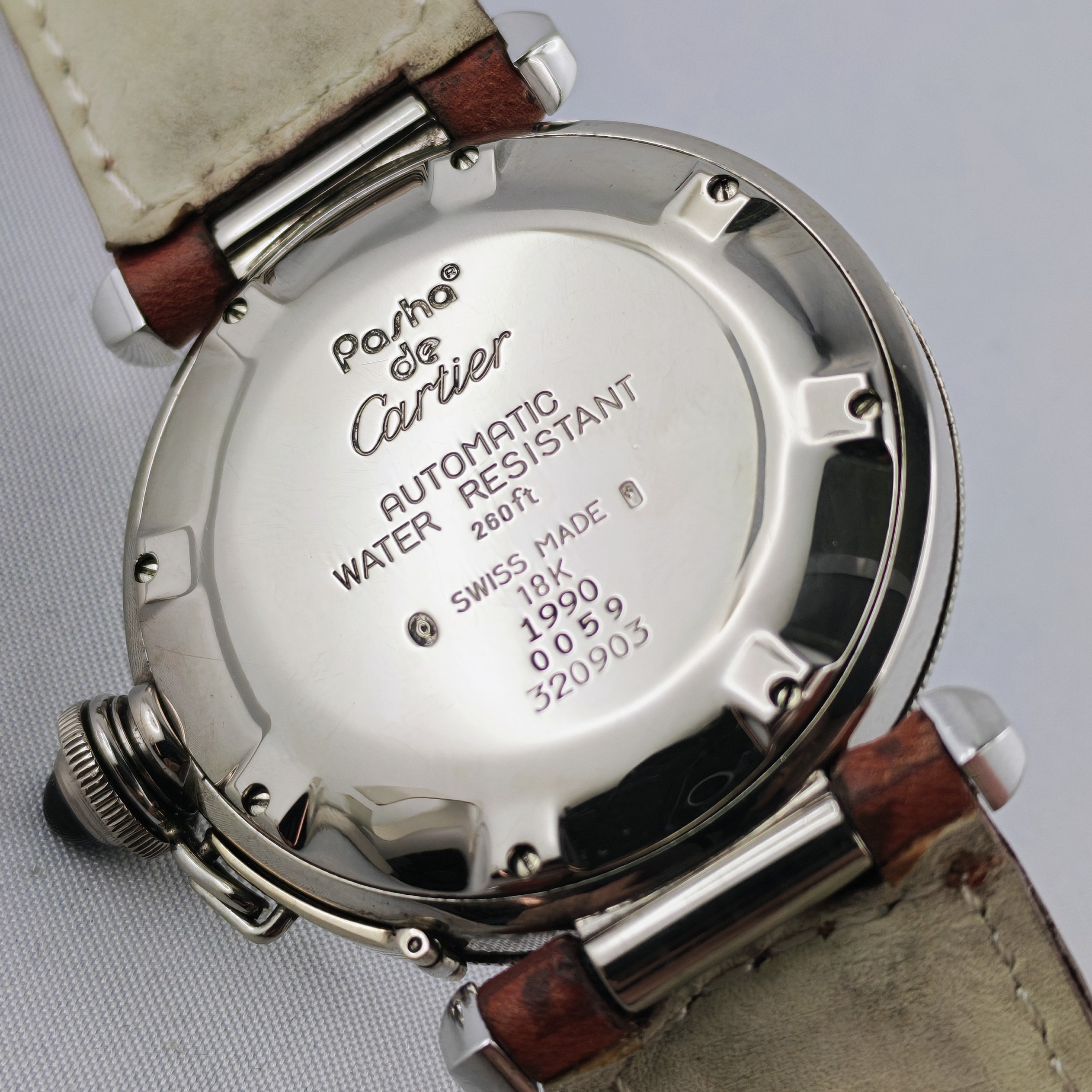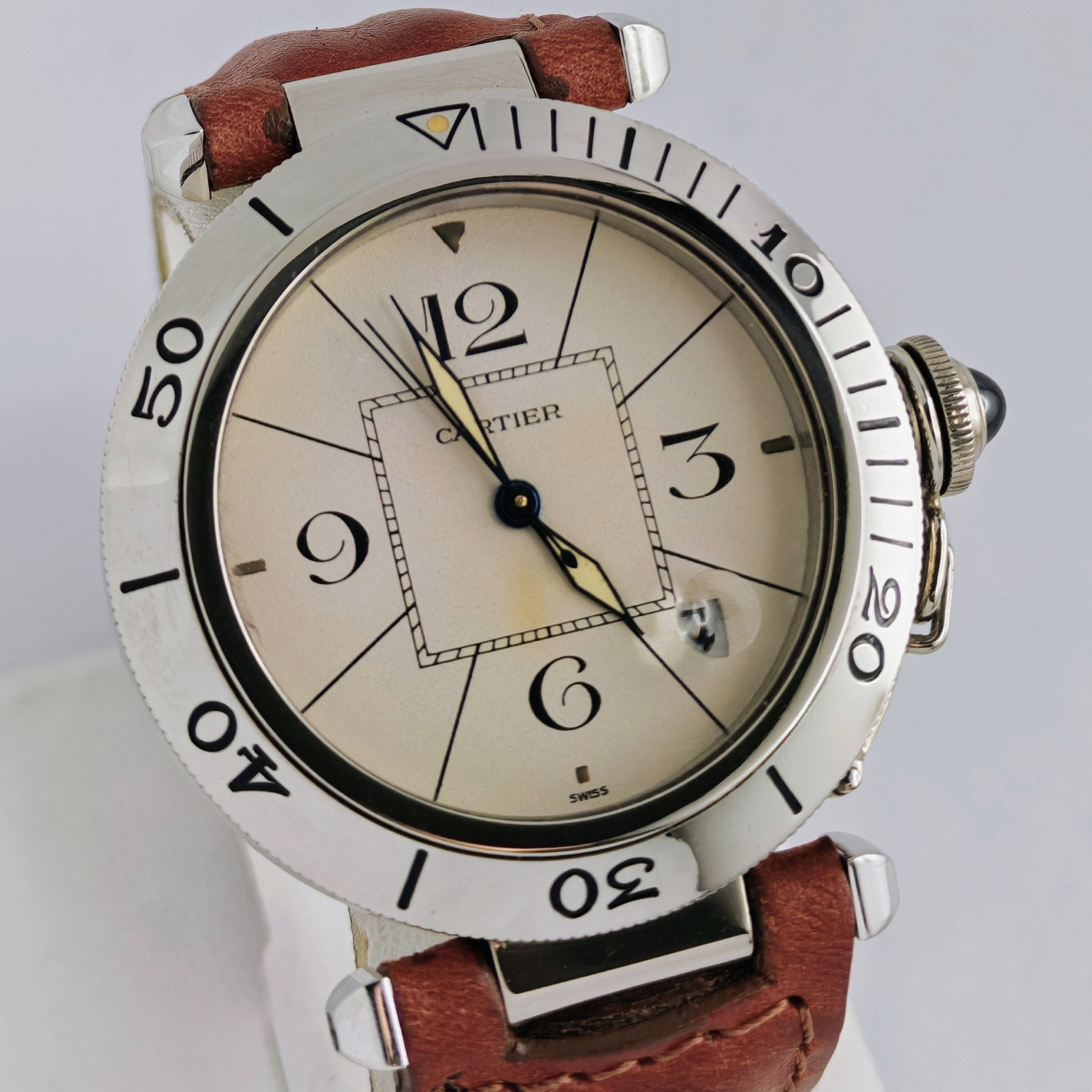 Non l’avevate mai vista questa versione in oro bianco del famoso Pasha de Cartier plongeur 38mm!! Automatico degli anni ’90, ci sono più di 65 grammi di oro, le condizioni della cassa sono eccellenti, tranne un piccolo alone nel quadrante.