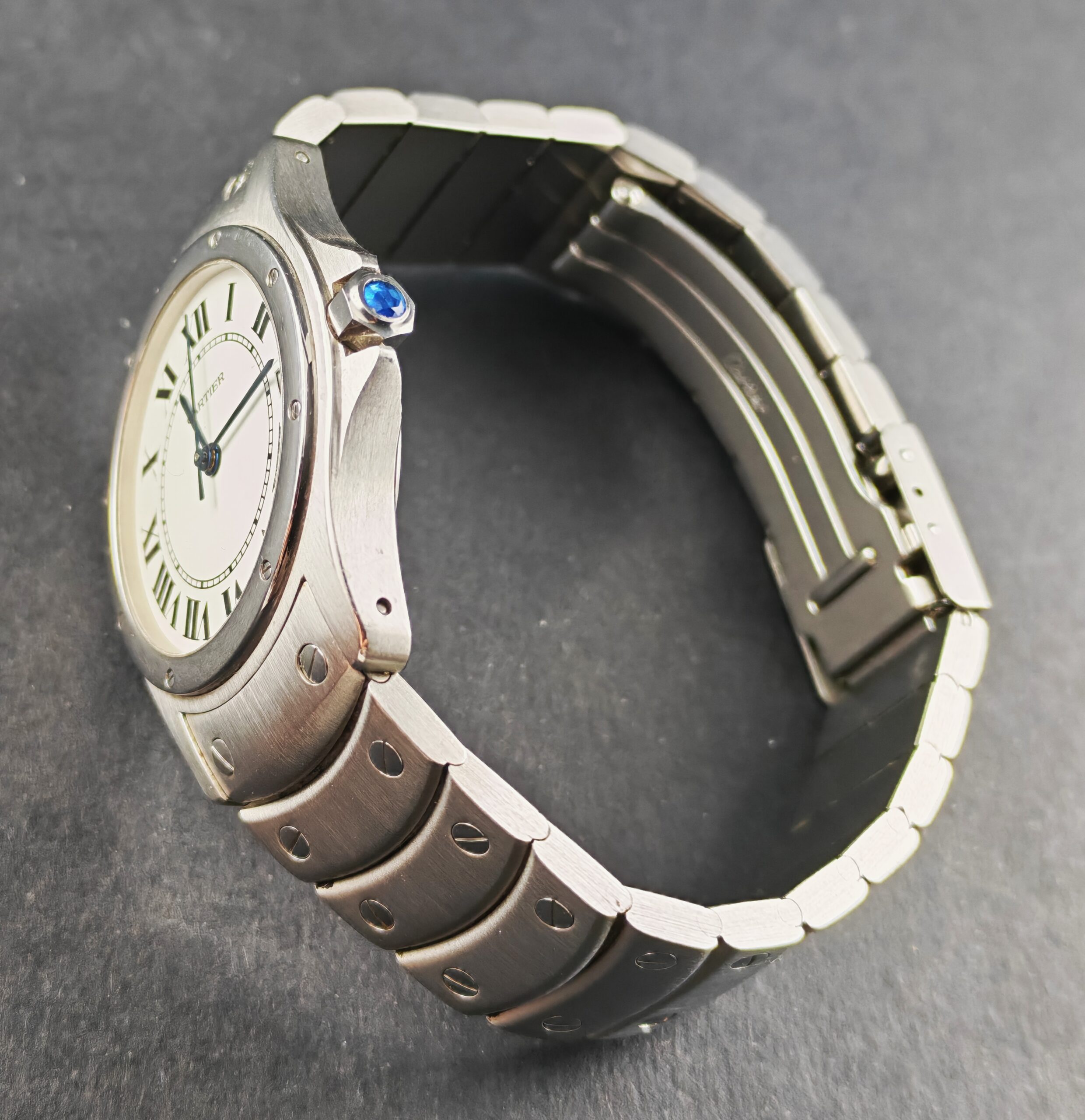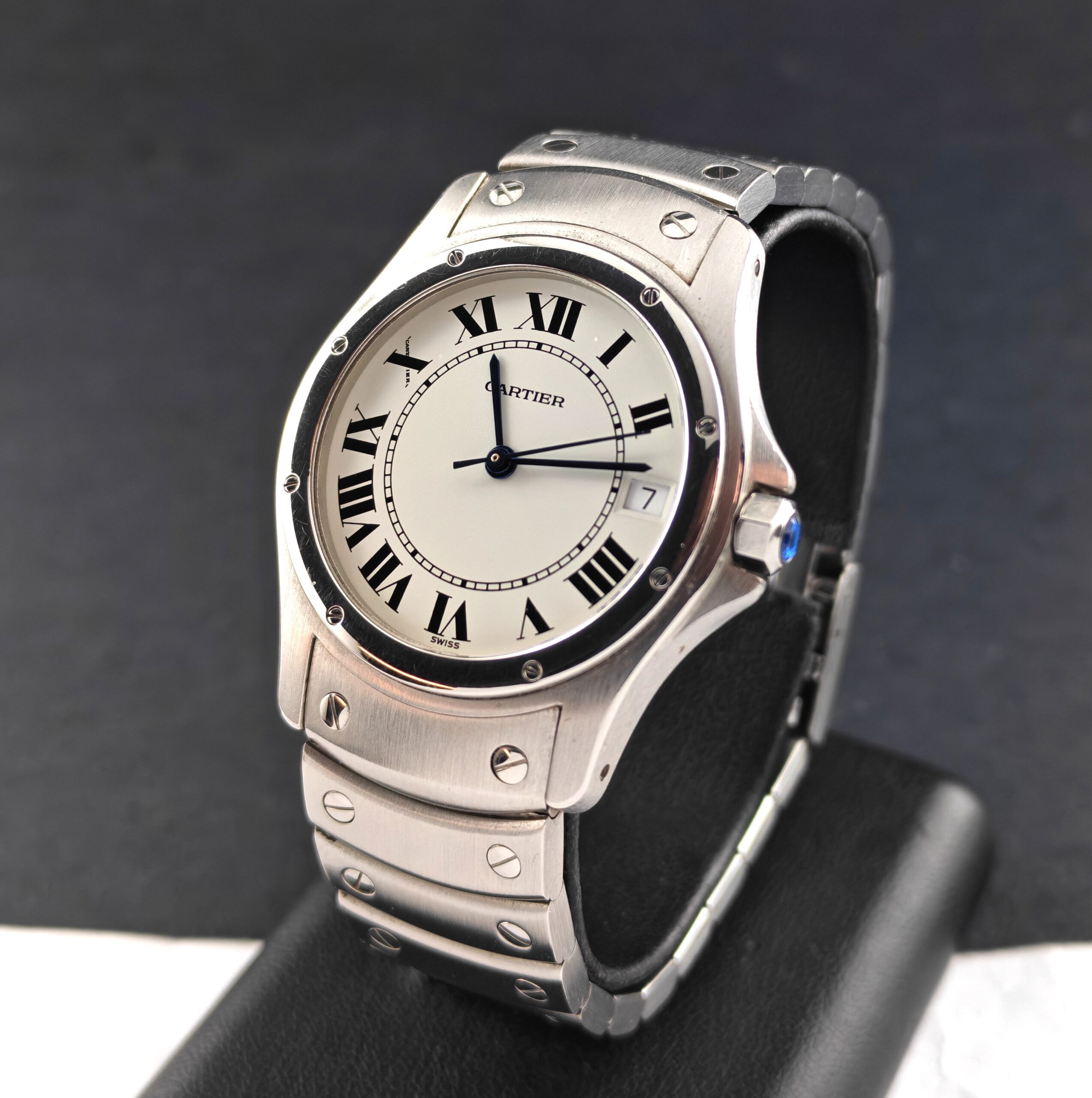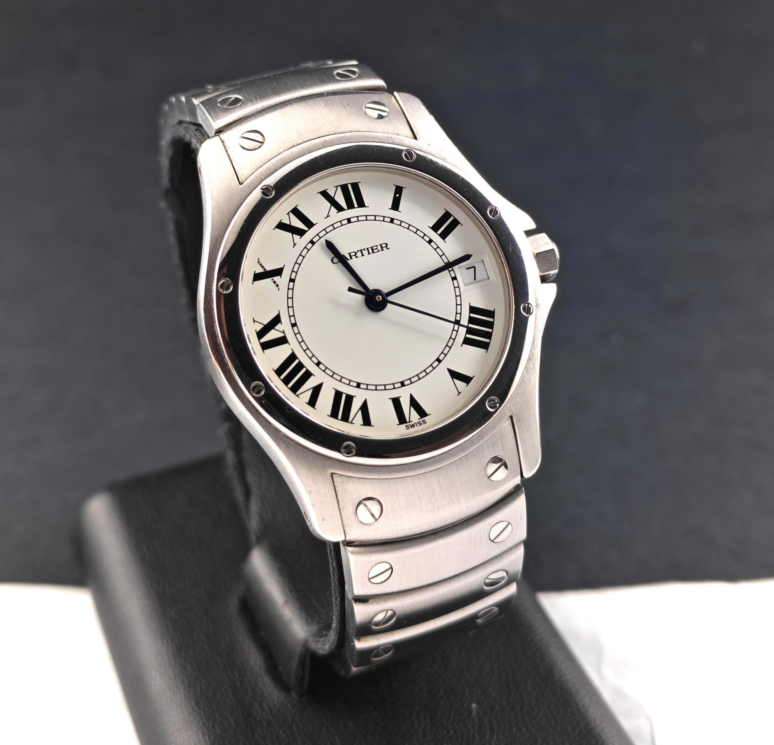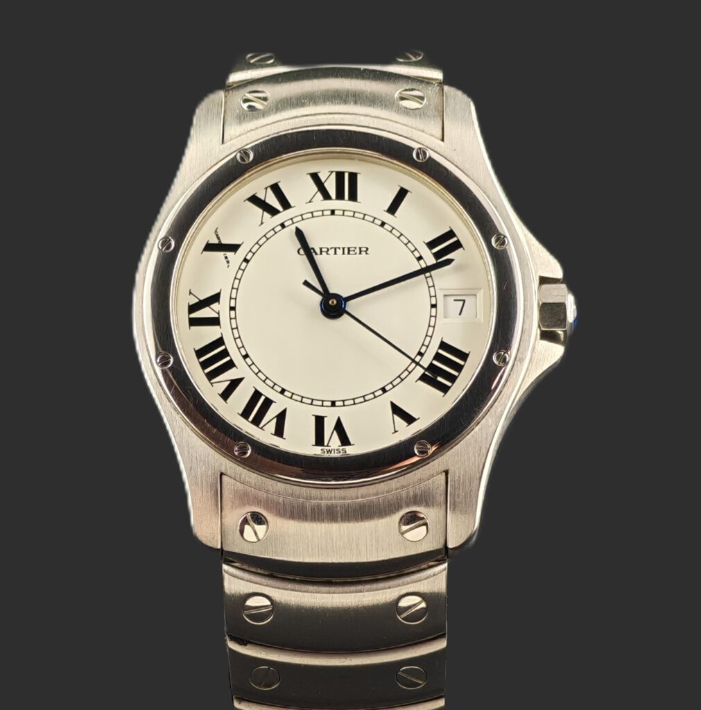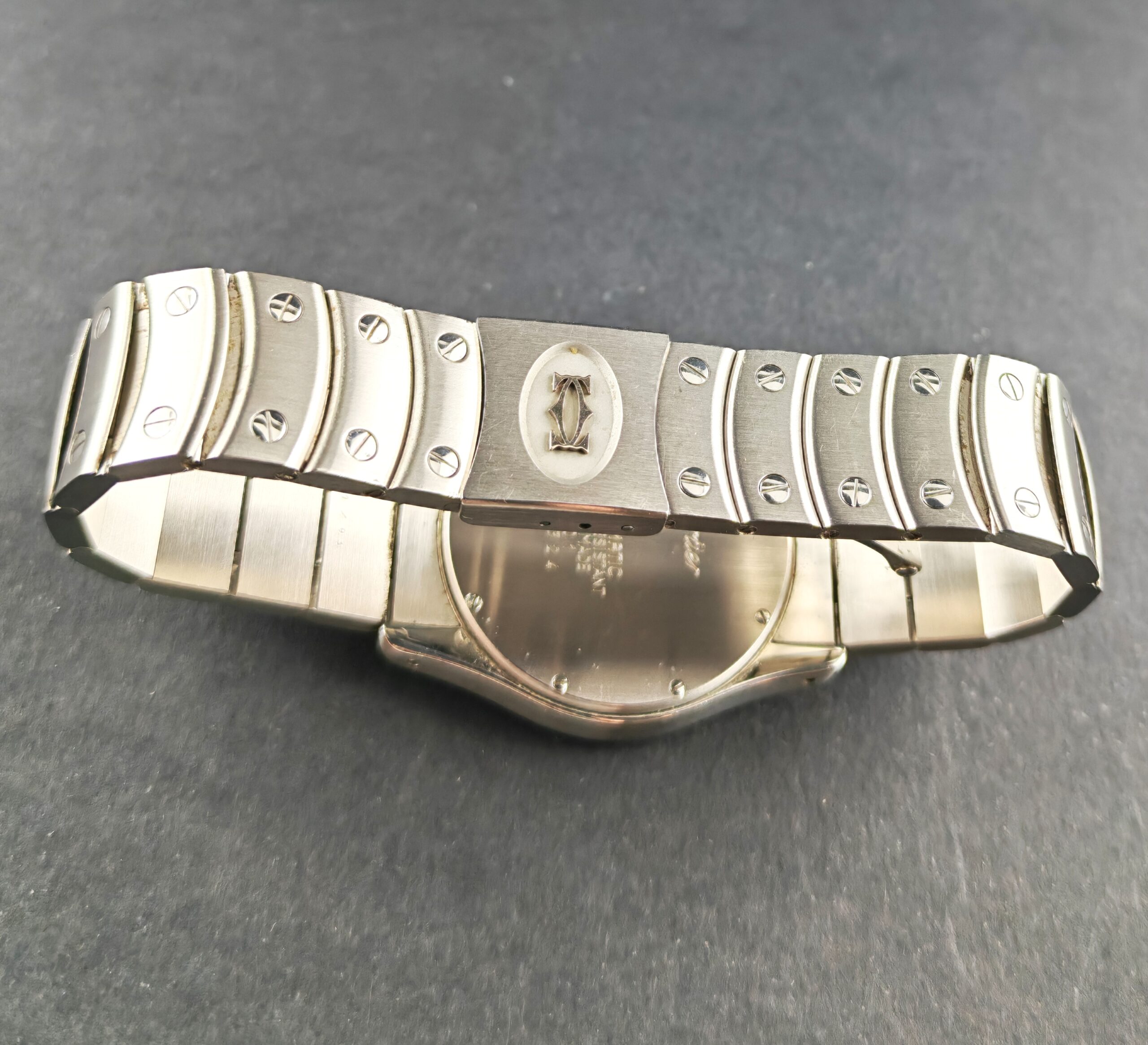 Con una cassa di medie dimensioni (33mm), presenta la classica lunetta dei Santos con viti a vista, un quadrante bianco con numeri romani e minuteria “a binario” e le lancette in acciaio blu. Da notare anche la scritta “Cartier” incisa in diagonale alle ore 10 e la finestrella del datario alle ore 3.