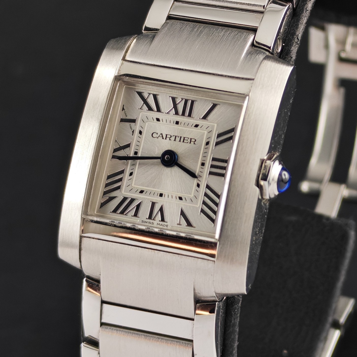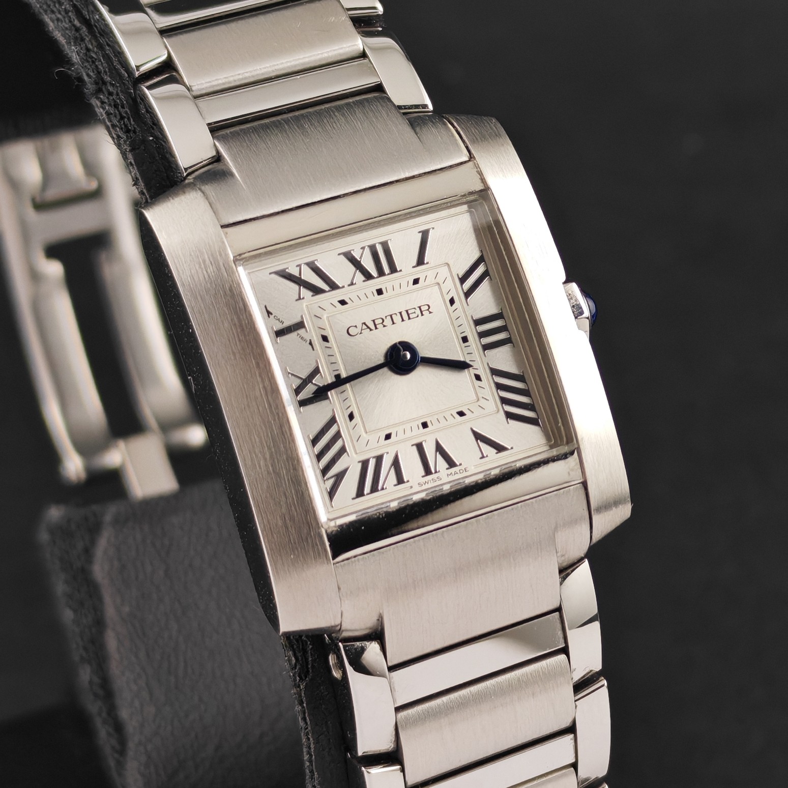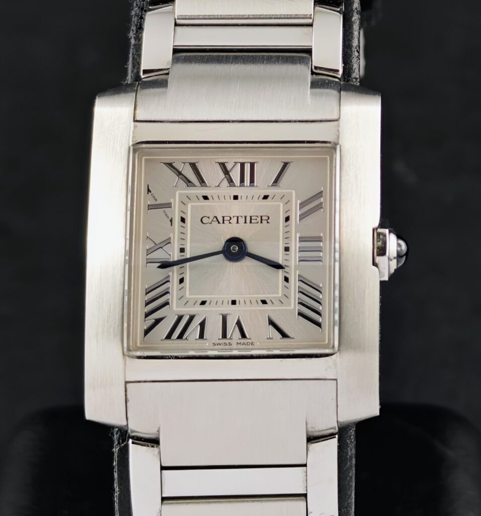 Vi presentiamo un magnifico Cartier Tank Française, con la referenza WSTA0129 che venne introdotta nel 1996: la linea Française, infatti, ha modernizzato il classico design Tank integrando perfettamente la cassa con un bracciale a maglie che ricorda i cingoli di un carro armato.