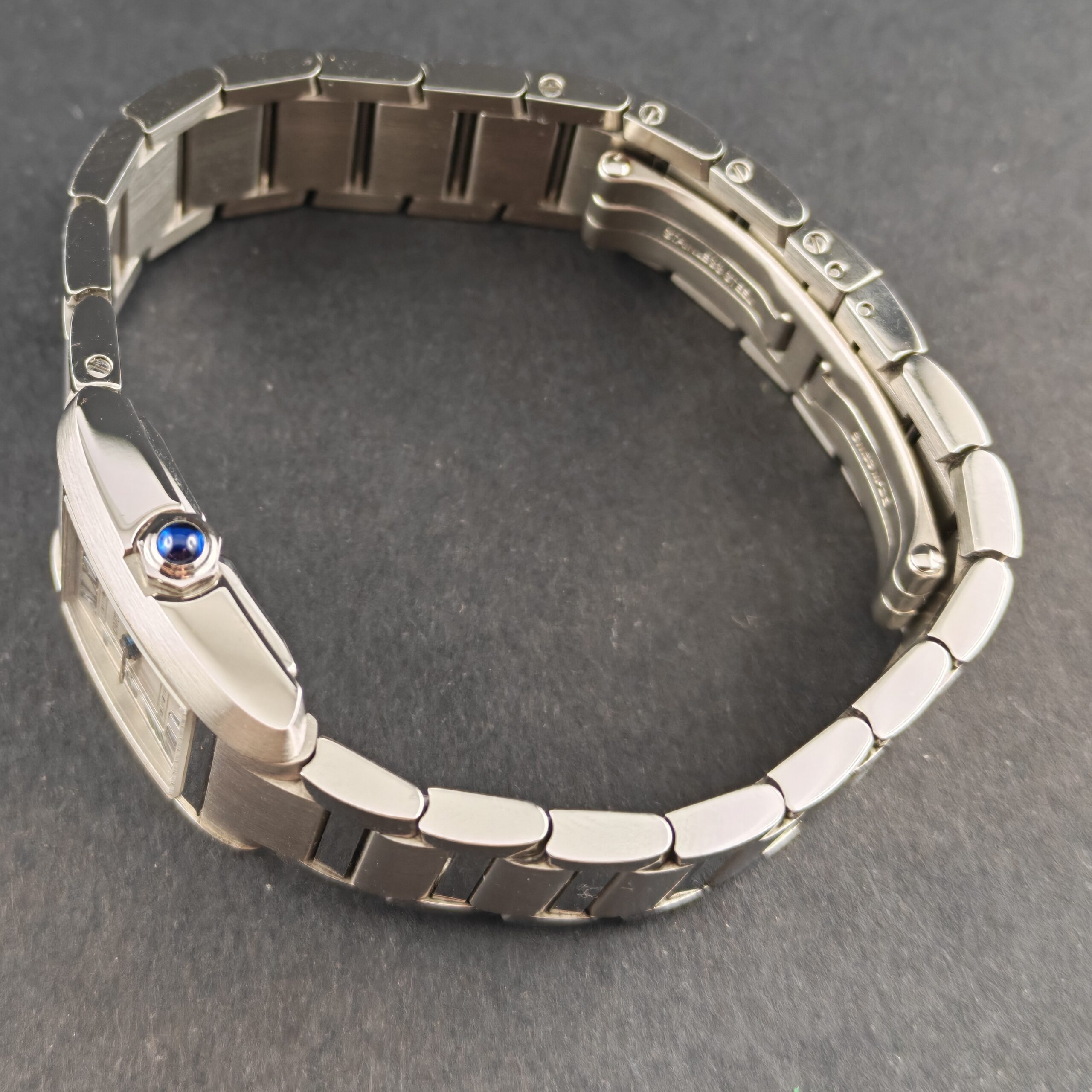 Questo quarzo monta una cassa con finitura satinata e lucida, con dimensioni di 25.7mm x 21.2 mm. Il quadrante, pezzo forte di questo orologio, è color argento con lavorazione soleil (a raggio di sole) e presenta i classici numeri romani Cartier e l’iconica minuteria “chemin de fer” (a binario).
