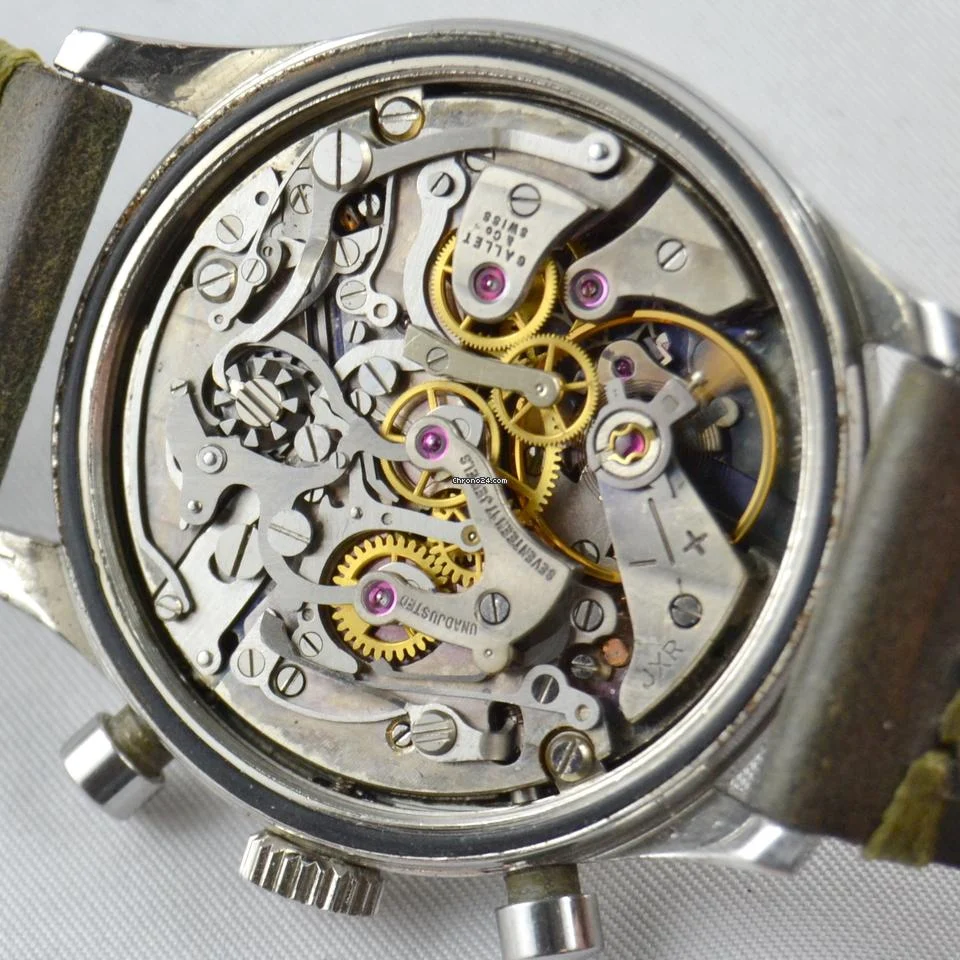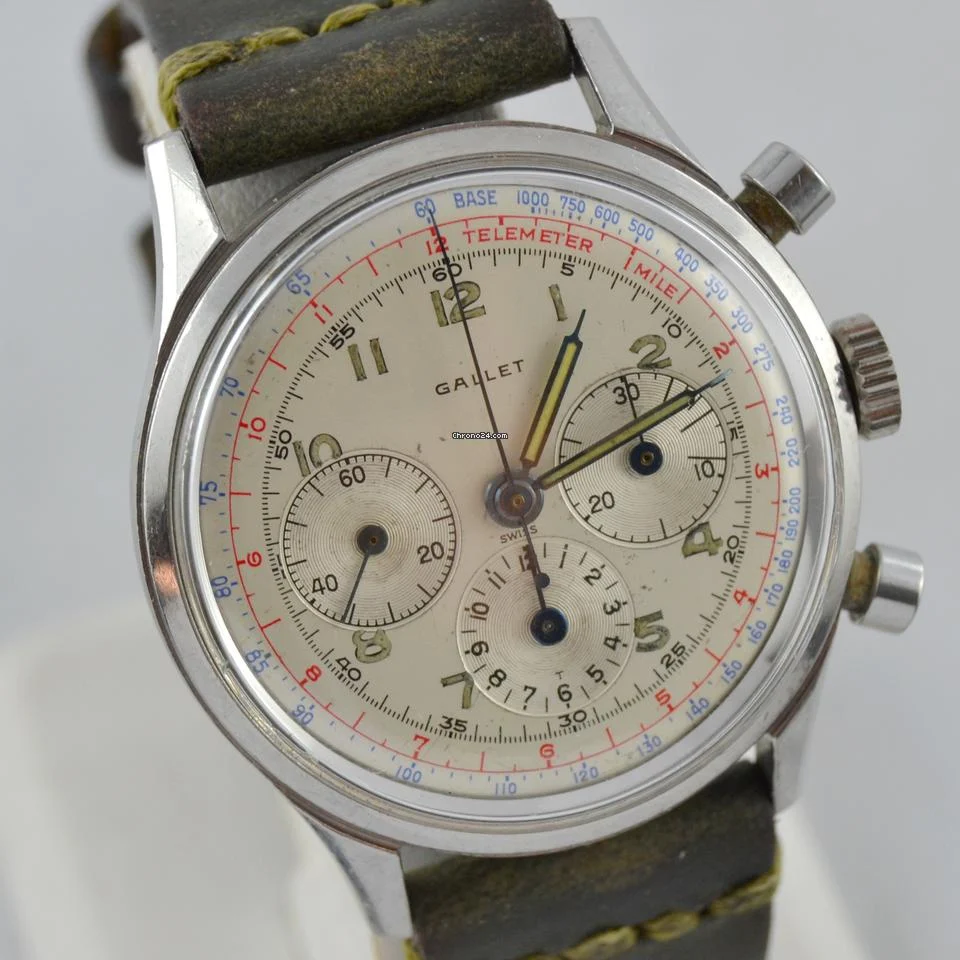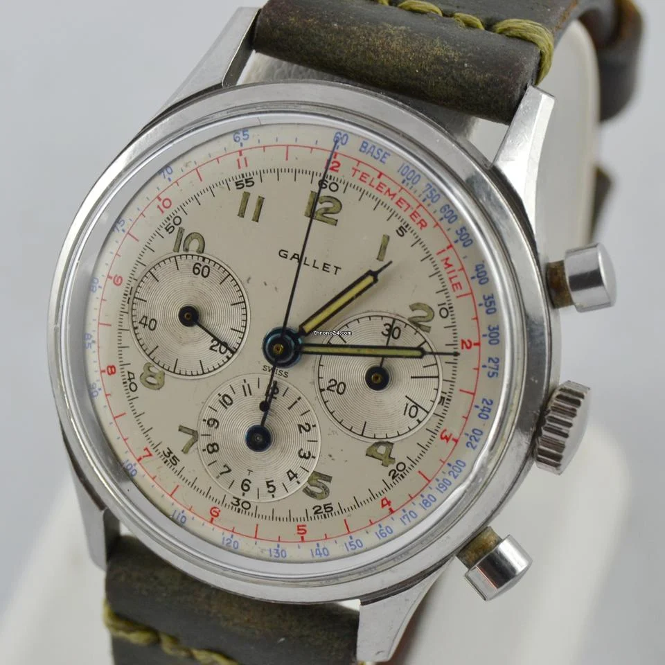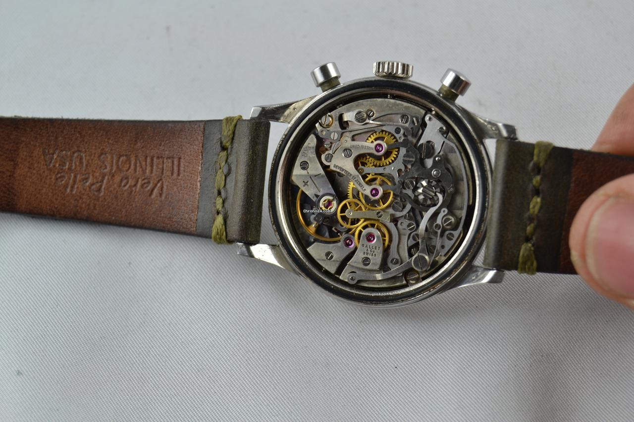 Indossato per una spedizione del 1963 sul monte Everest, utilizzato per alcune missioni spaziali Apollo Prodotto dalla fine degli anni 50 a fine anni 70, questo modello è stato il più venduto e il più richiesto, si presenta con le lancette e indici in trizio ancora bel tenute, doppia scala tachimetrica e telemetrica ed indicazione dei secondi cronografici per una migliore leggibilità. Questo Gallet è del 1963, la T al centro del contatore alle ore 6 era a simboleggiare la differenza tra i quadranti Radium e quelli già in trizio, come questo esemplare che si presenta in ottime condizioni, con lievi segni sul quadrante e piccoli segni sulla cassa. Ma la sua forza principale si trova nel movimento: Excelsior Park 40-68 uno dei calibri più belli e più complessi mai creati dall’orologeria svizzera Sprovvisto di scatola e garanzia ufficiale |