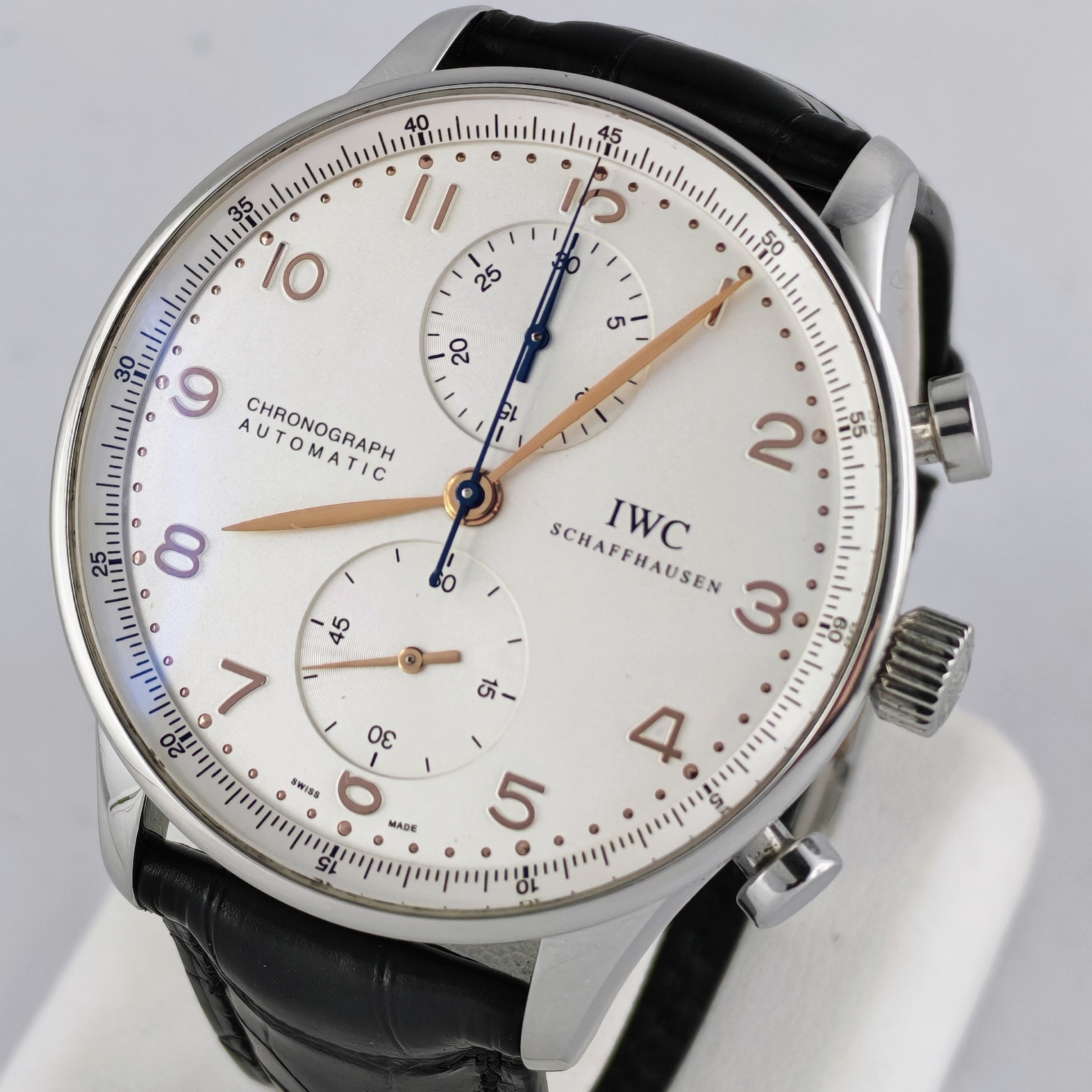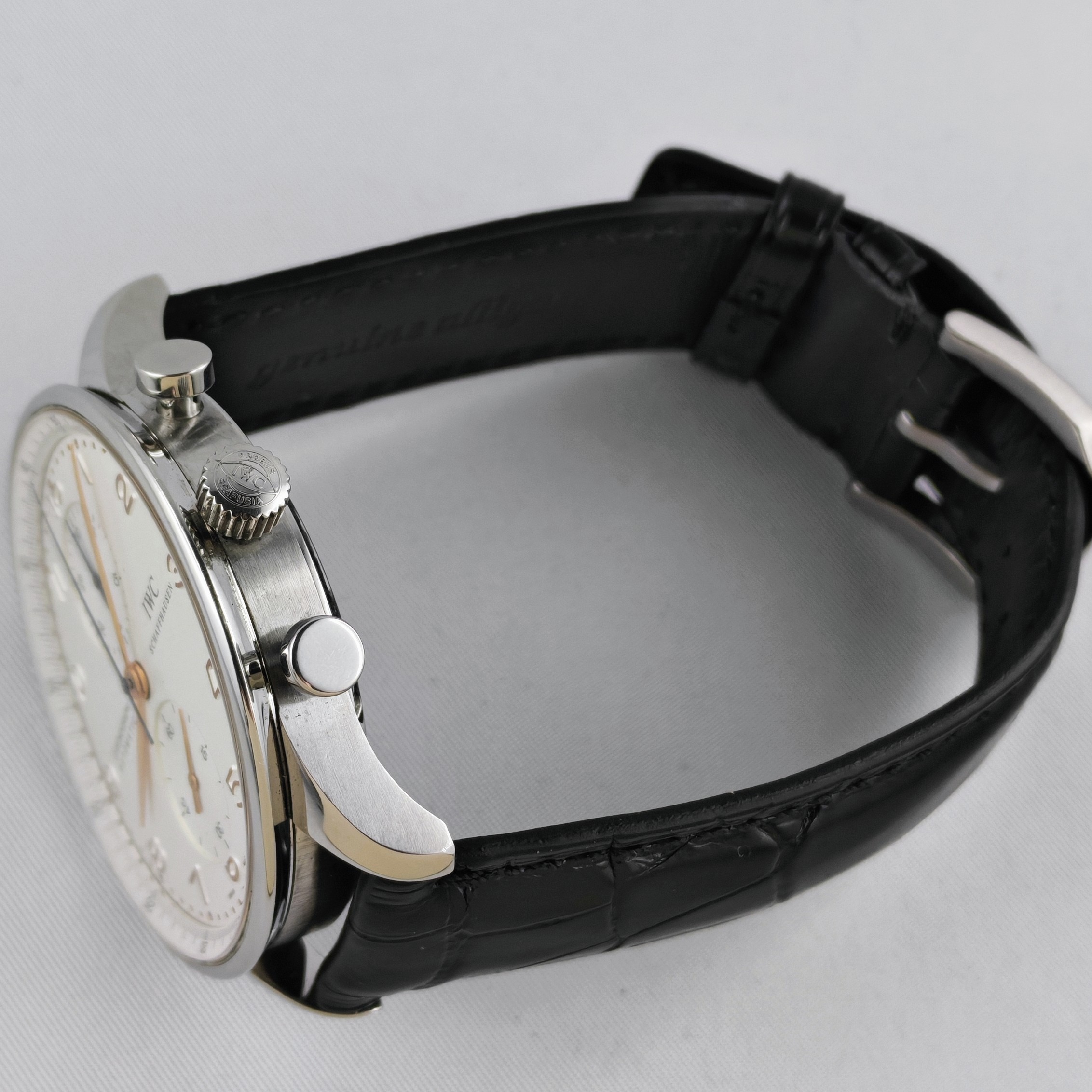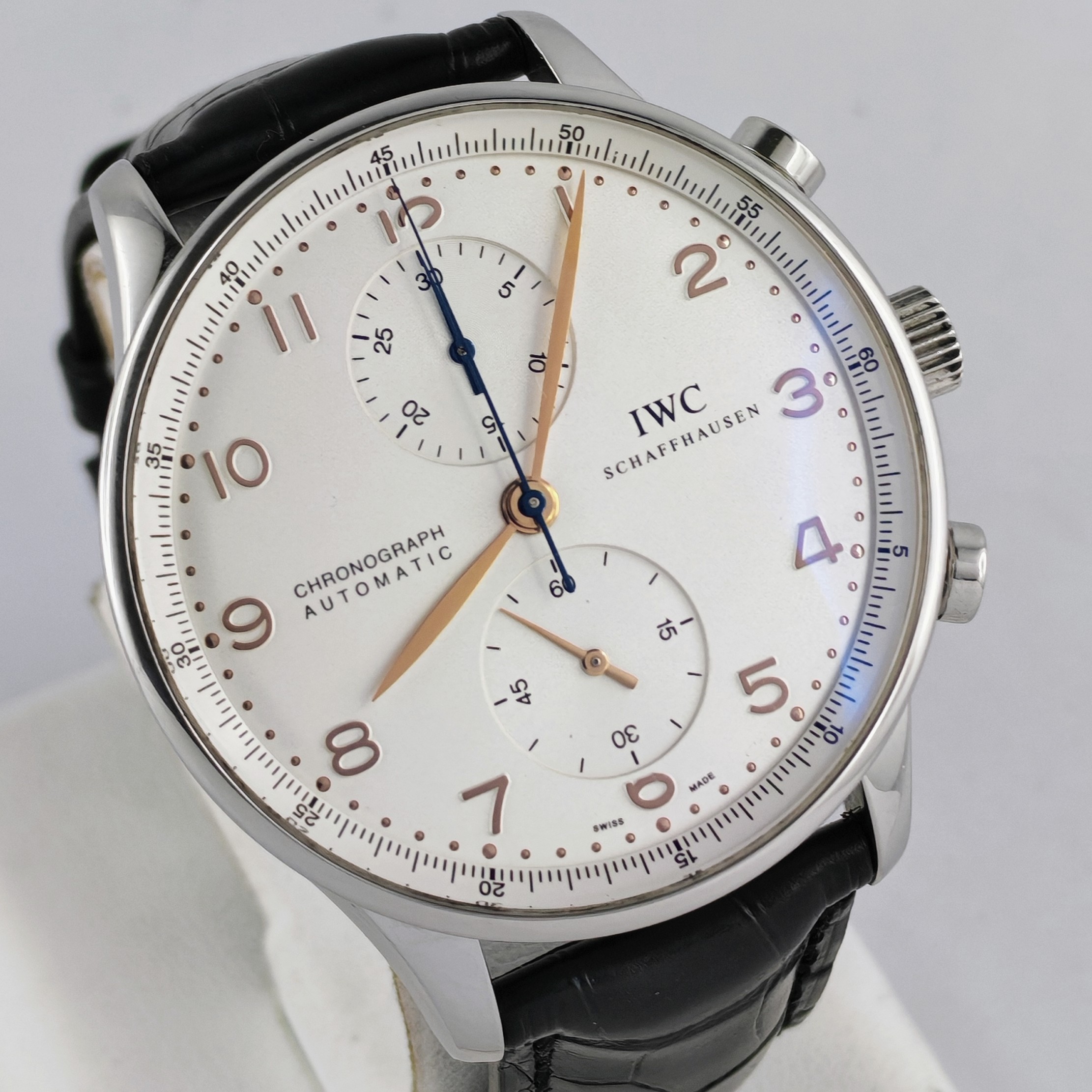 Questo modello della Iwc si chiama Portoghese ed è uno dei pochi orologi che racchiude in sé eleganza (io suo stile classico e lineare), ma sportività nello stesso tempo( il cronografo è a tutti gli effetti uno sportivo), quindi perfetto sotto tutti gli abbinamenti. Piccolissimi segni appena visibili, sprovvisto di scatola e garanzia ufficiale
