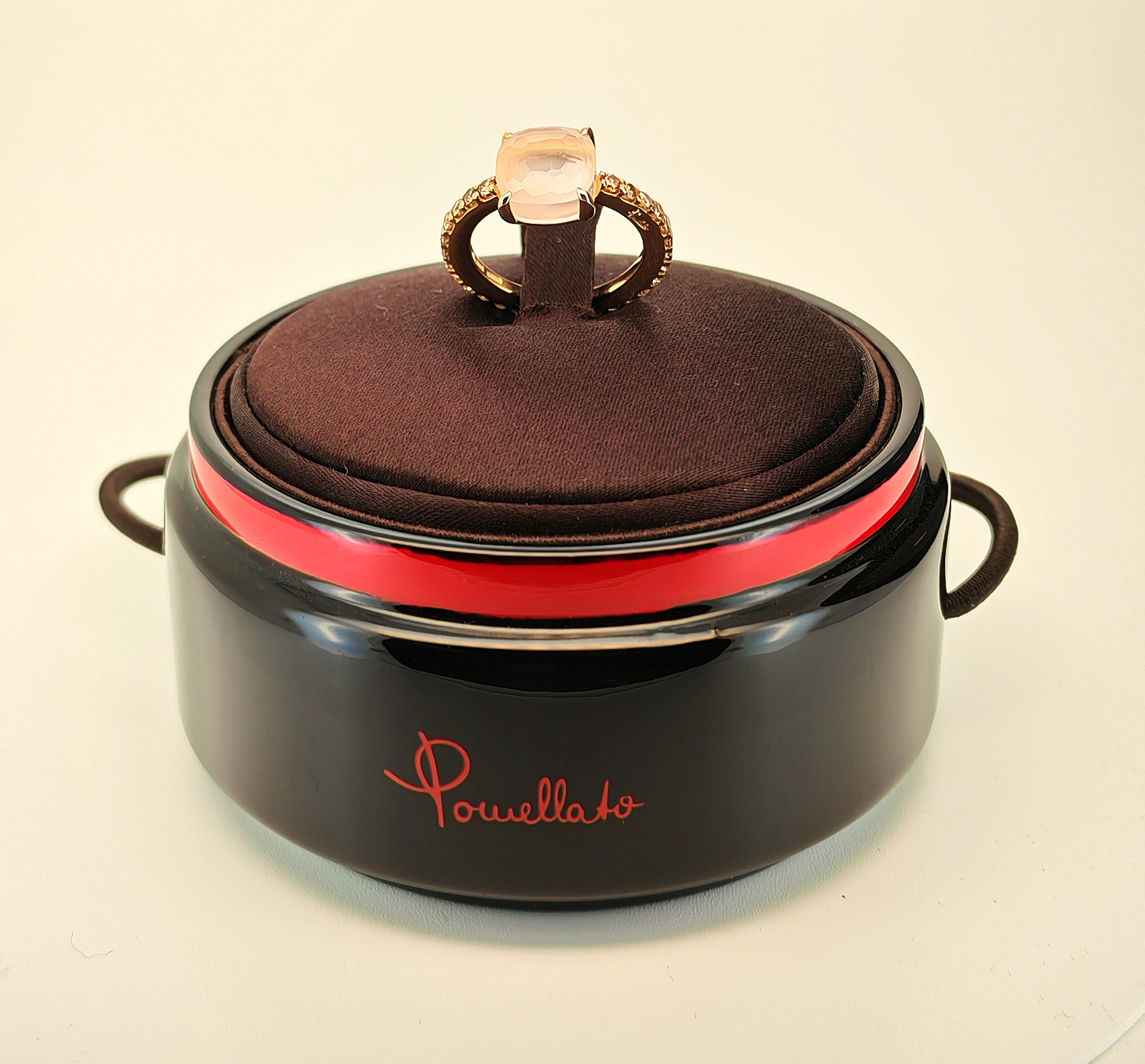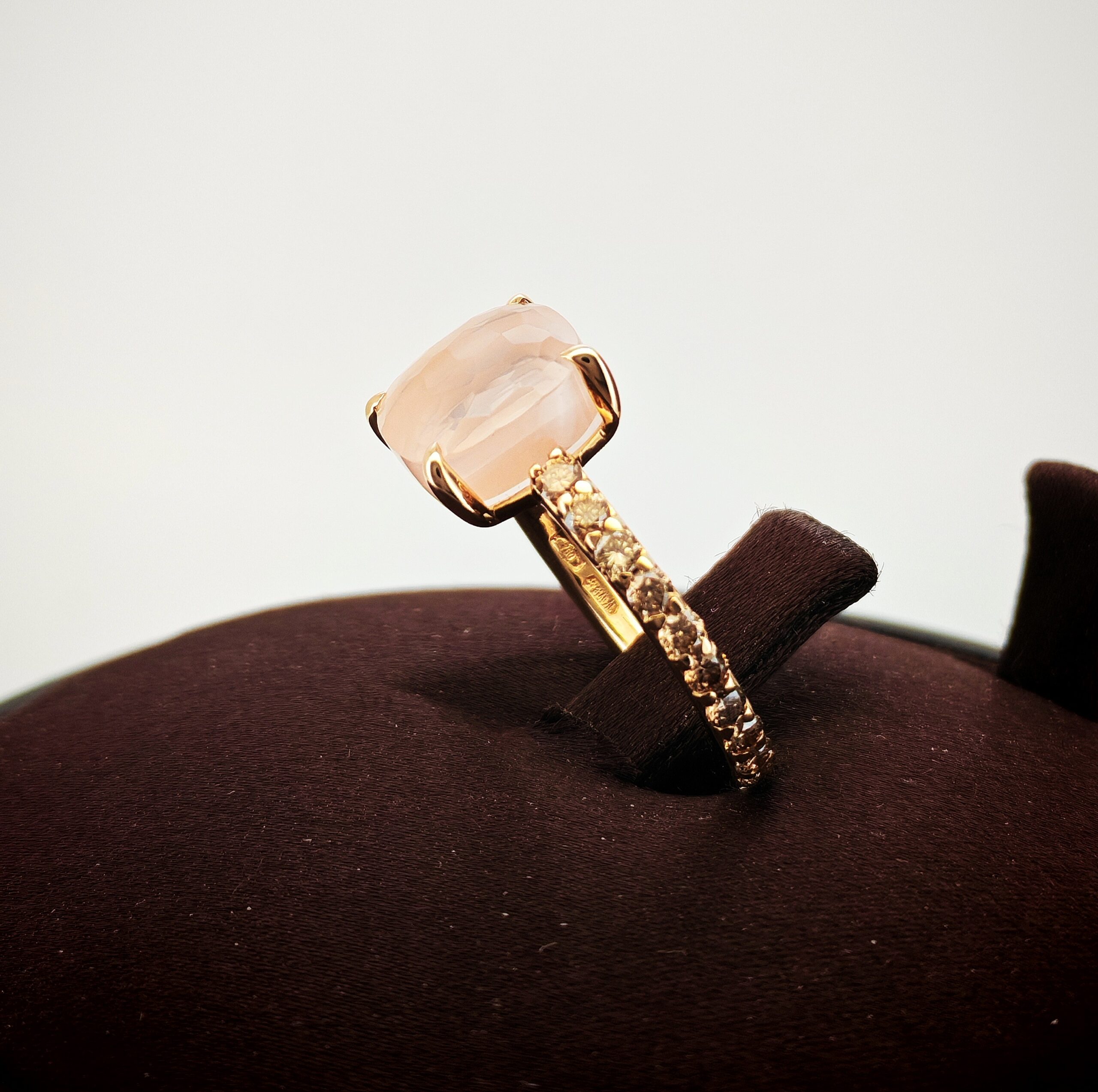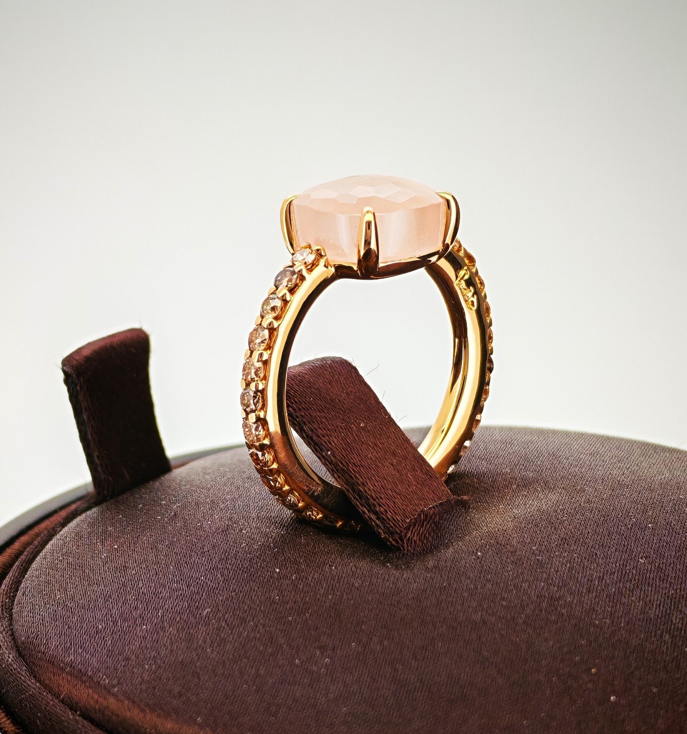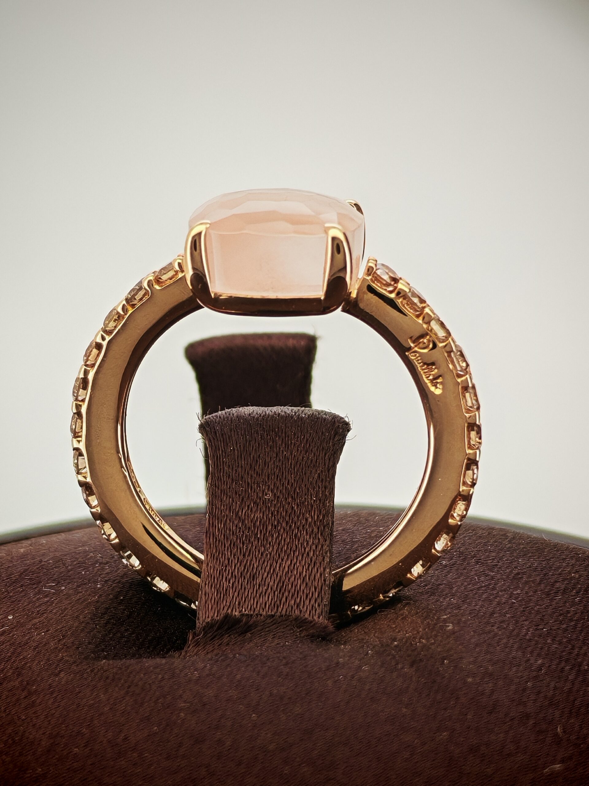 Vi presentiamo uno splendido anello Pomellato della collezione “Baby”. L’anello, in oro rosa, è accompagnato da un bordo di diamanti “brown” ed è complimentato dalla pietra in quarzo rosa.