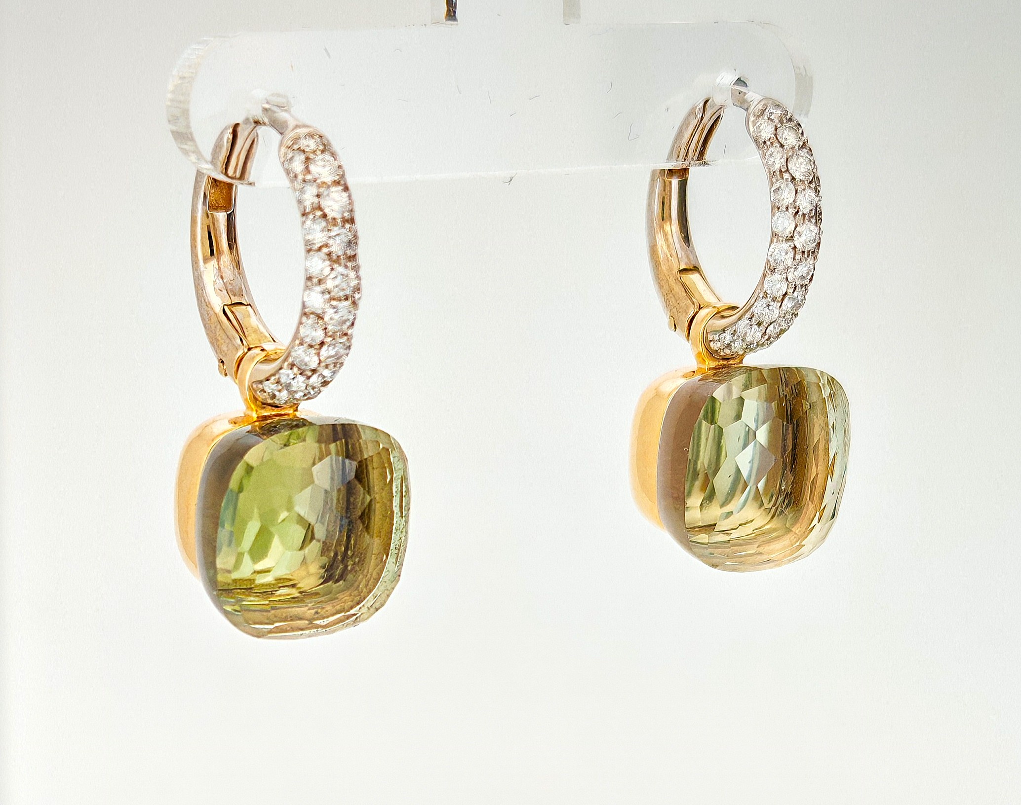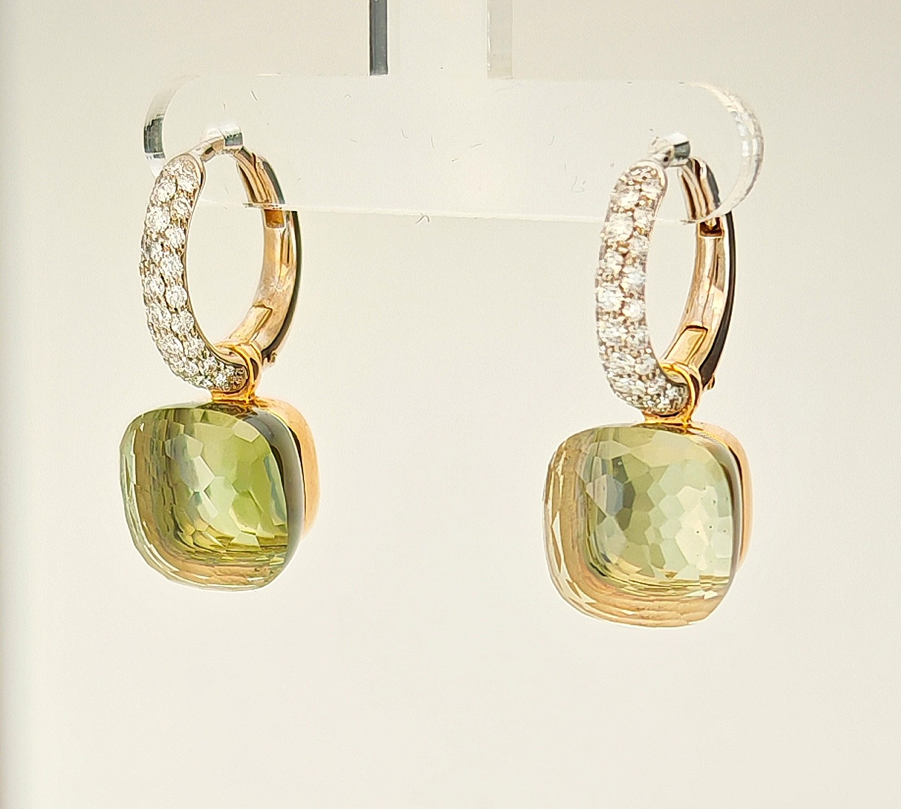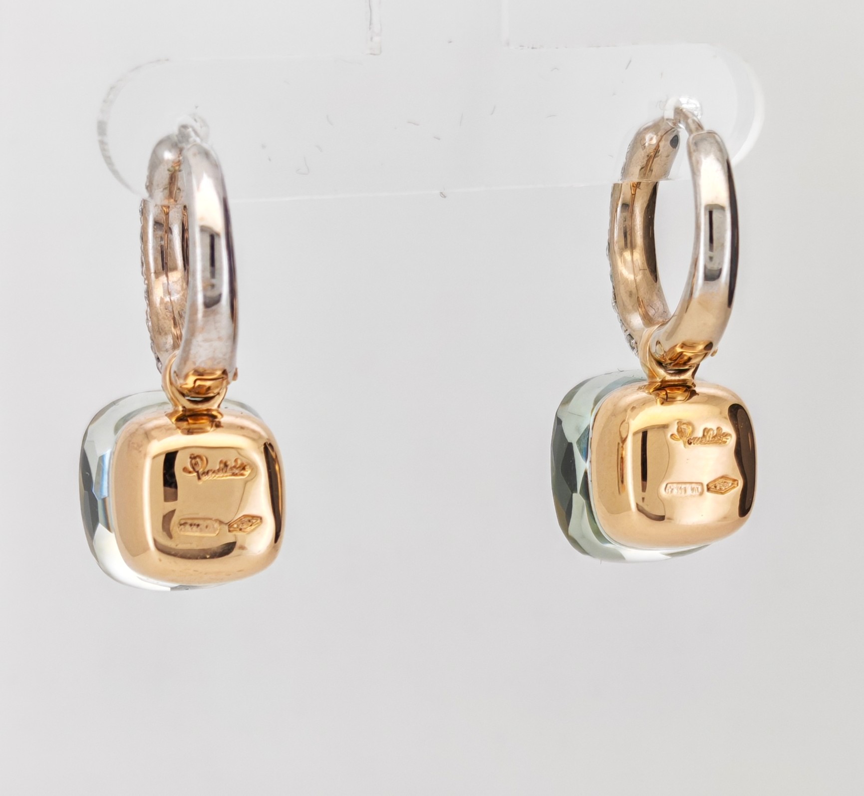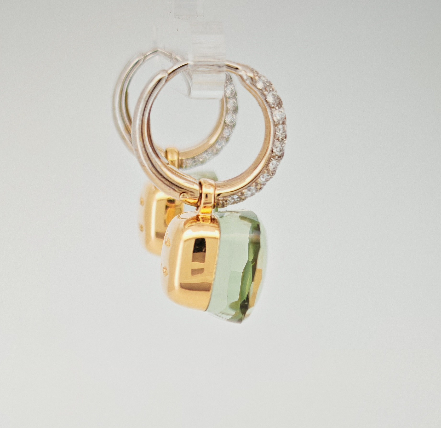 Vi presentiamo degli splendidi orecchini Pomellato appartenenti alla collezione “Nudo”. In oro rosa, presentano una fascia di diamanti e una pietra in prasiolite.