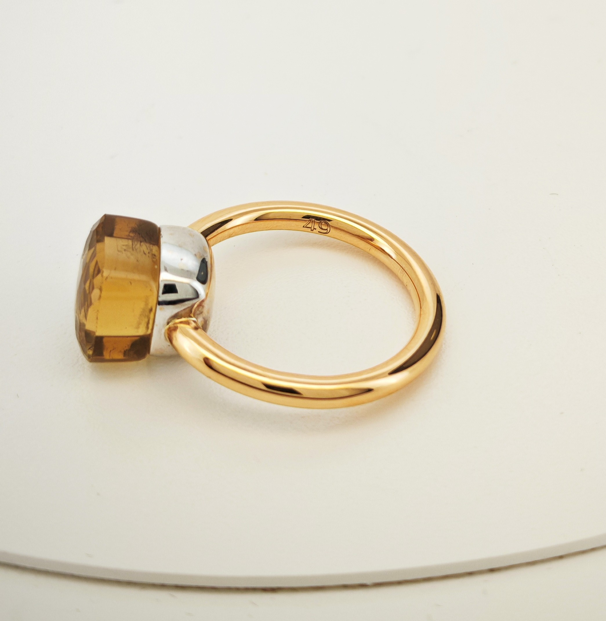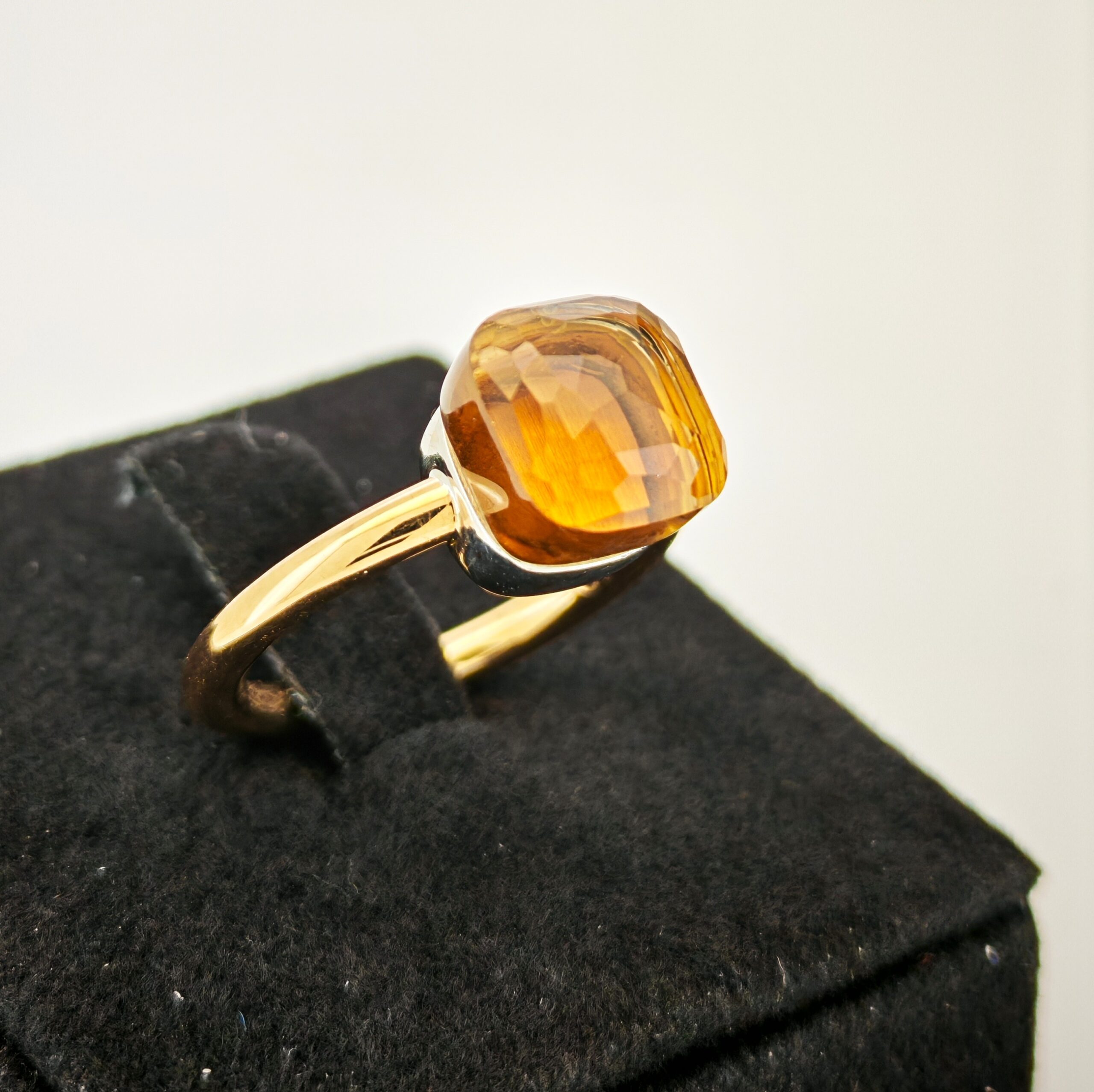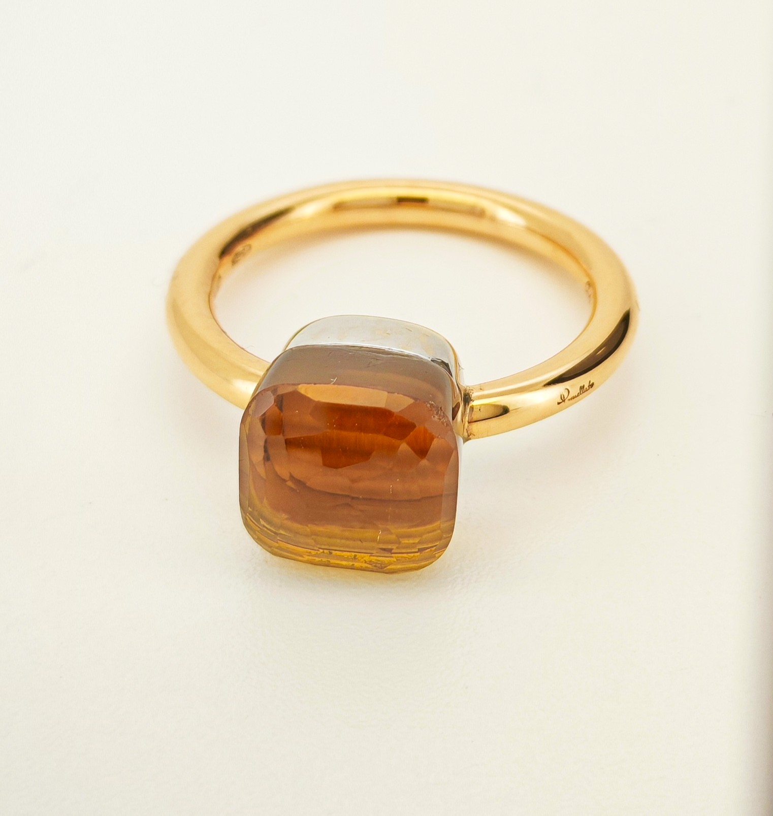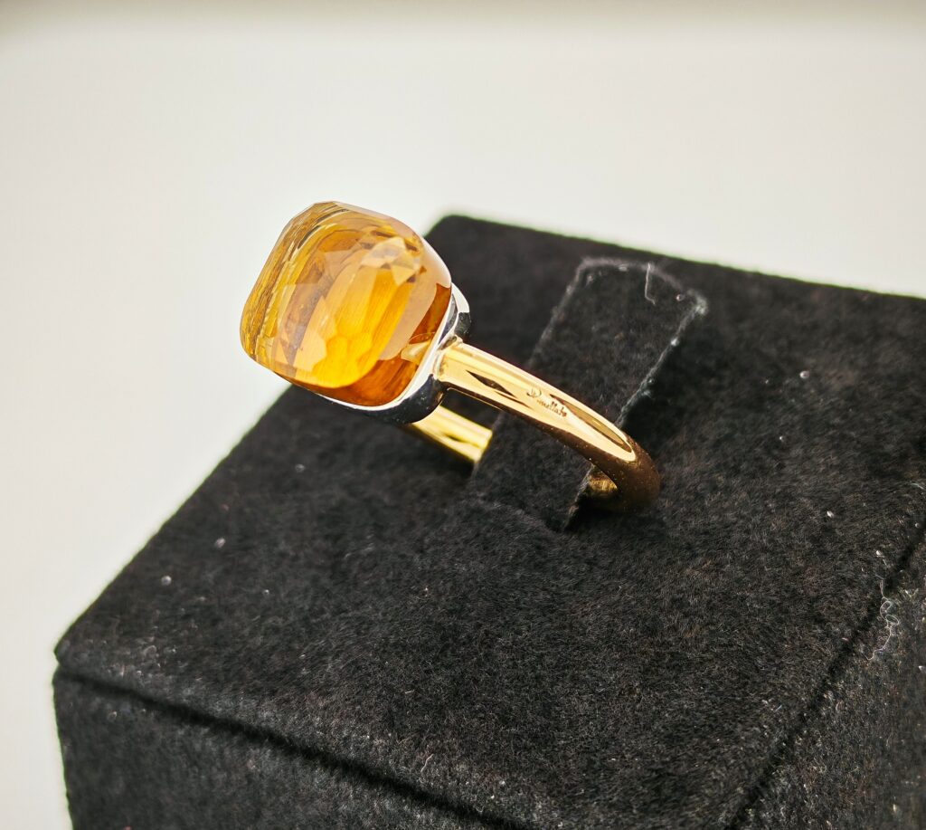 Vi presentiamo un elegante anello Pomellato in oro rosa della Collezione Nudo. Sopra di esso è montata una pietra in Topazio Citrino, che si appoggia su una base in oro bianco.