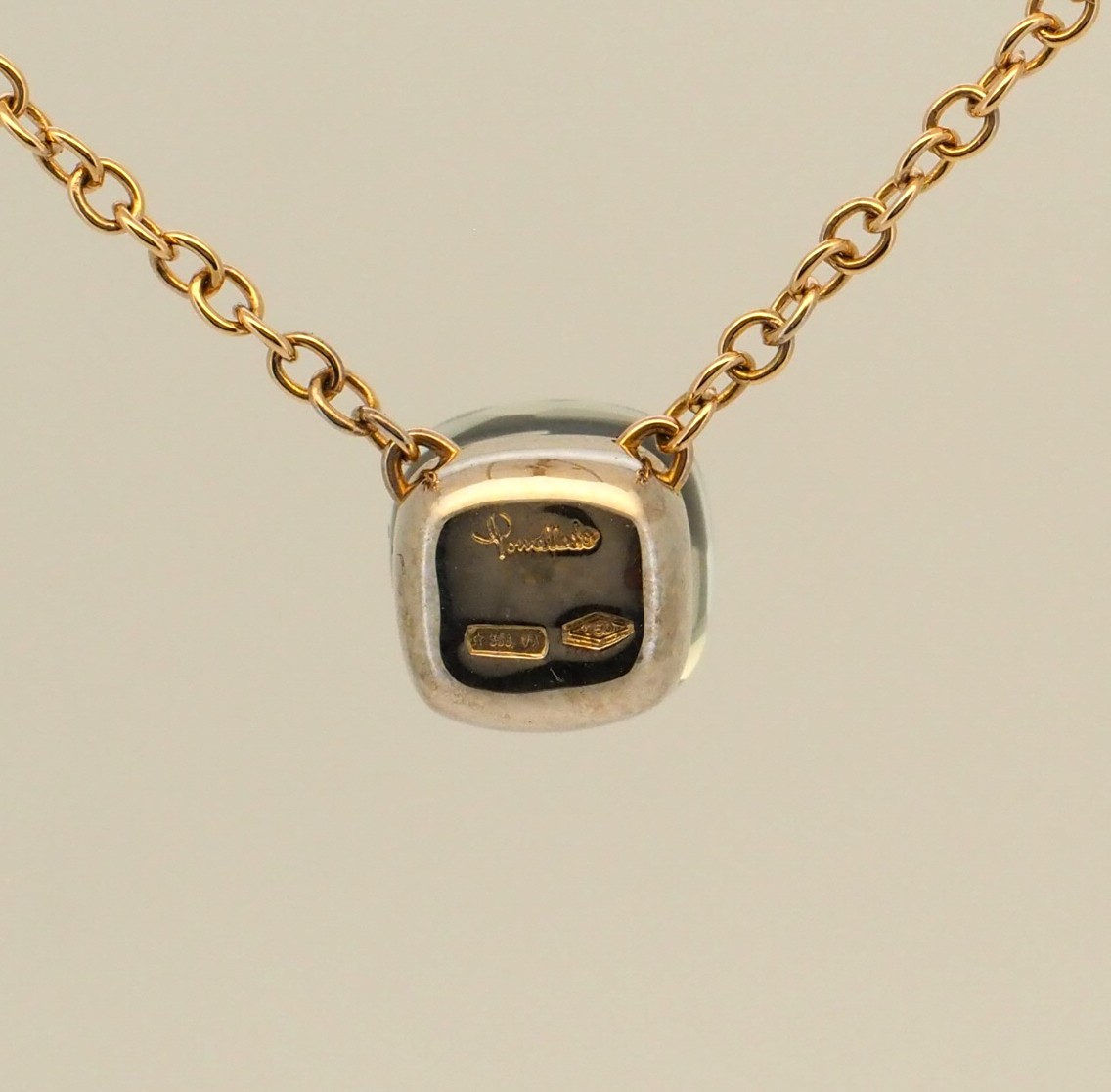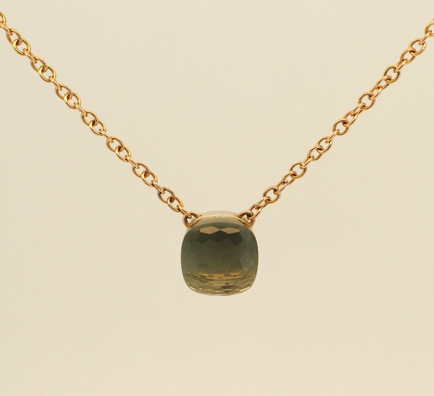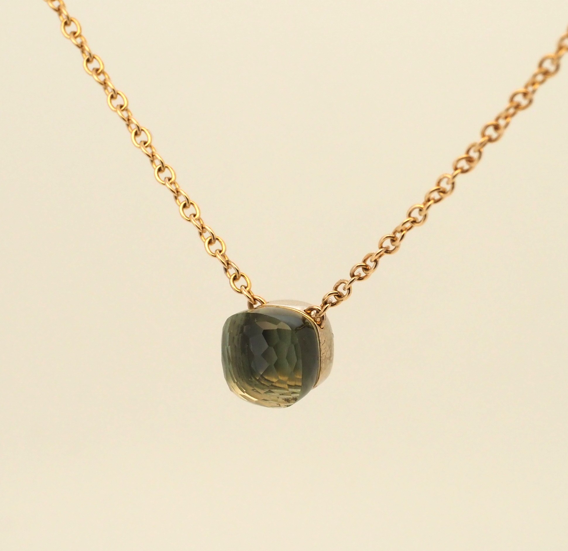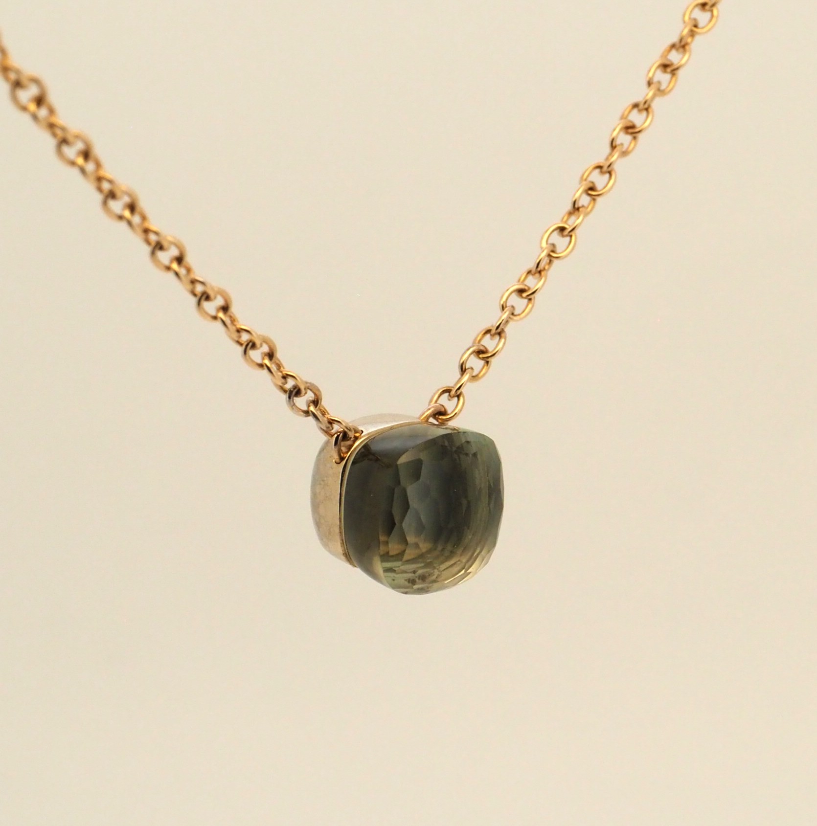 Vi presentiamo una collana Pomellato della collezione “Nudo Petit”. Interamente in oro rosa, su di essa è montata una gemma di tormalina verde.