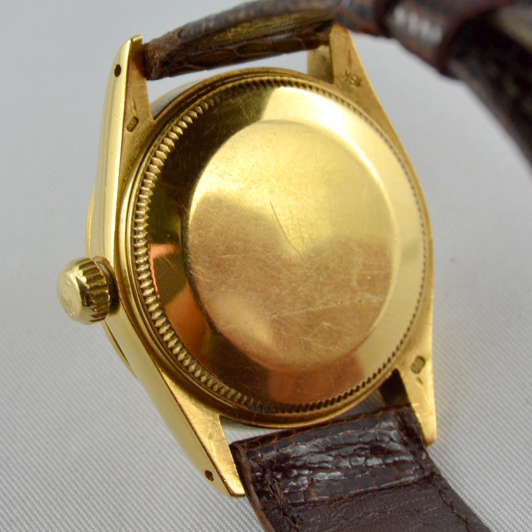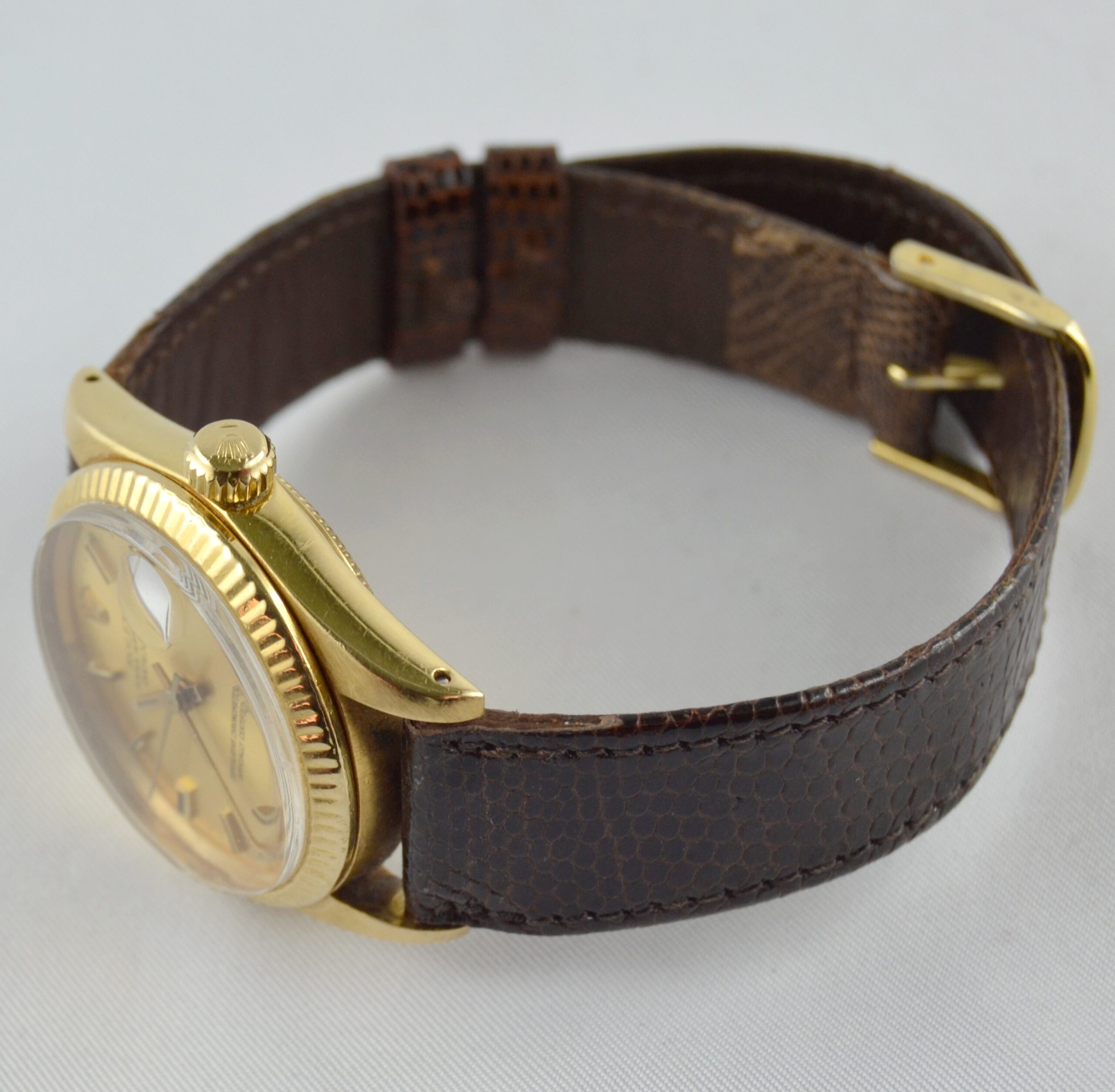 L’eleganza dell’oro è esaltata dall’abbinamento ad un cinturino marrone scuro. Con un quadrante protetto da un vetro plastica, l’orologio non possiede il corredo originale e presenta alcuni segni sul vetro e sulla cassa.